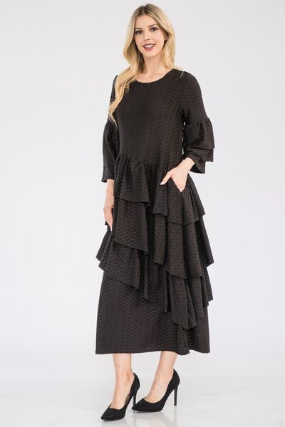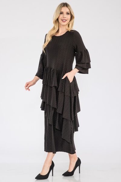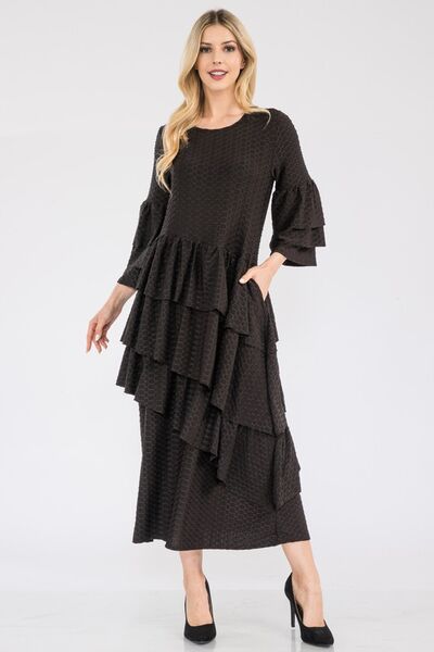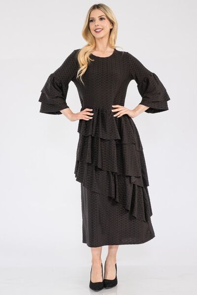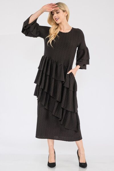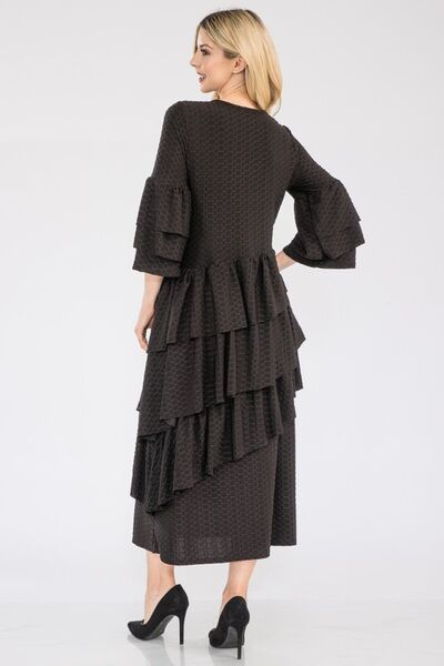The Honey Comb Asymmetrical Ruffle Midi Dress is a unique and sophisticated choice for any occasion. Featuring a stunning honeycomb pattern and a stylish asymmetrical ruffle detail, this dress combines elegance with a modern twist. Perfect for adding a touch of charm and flair to your wardrobe, this dress is sure to make you stand out in a crowd.