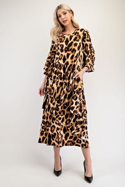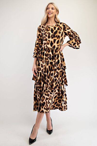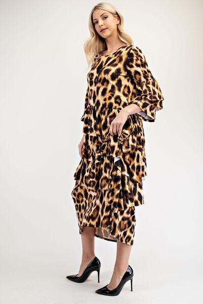 The Leopard Asymmetrical Ruffle Midi Dress is a bold and stylish choice for those who want to make a statement. With its eye-catching leopard print and asymmetrical ruffle detail, this dress exudes confidence and elegance. Perfect for both casual and dressy occasions, this dress is sure to turn heads wherever you go.