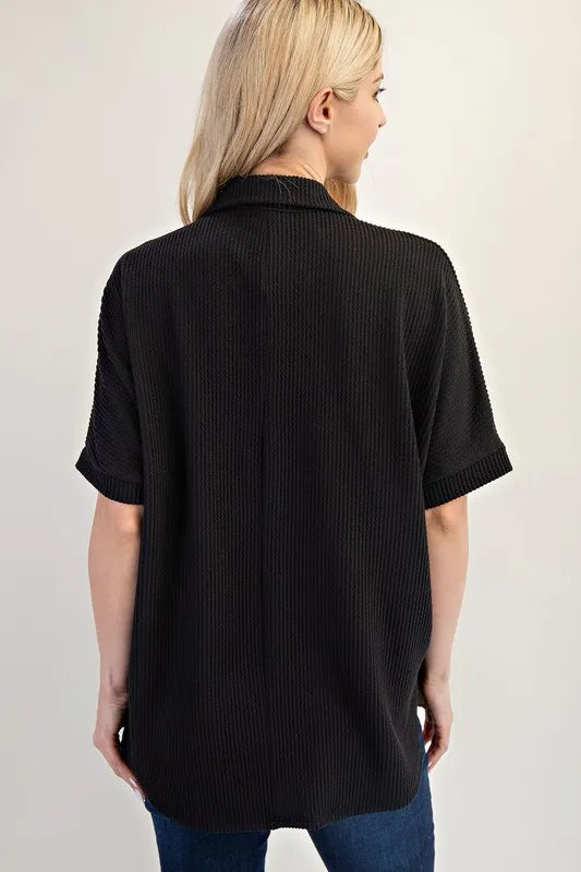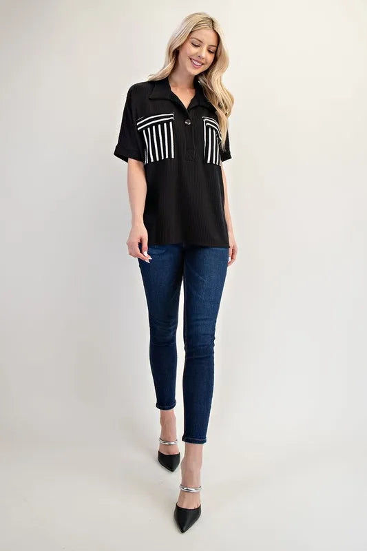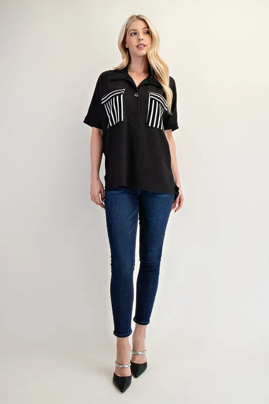 Add a touch of sophistication to your outfit with this Rib Knit Collared Top featuring stylish Striped Pockets. The ribbed knit fabric gives a cozy and comfortable feel, while the collared neckline adds a polished look. The striped pockets provide a trendy pop of pattern and contrast. This top is versatile and perfect for both casual and office wear. Pair it with your favorite pants or skirt for a chic and effortlessly put-together look.