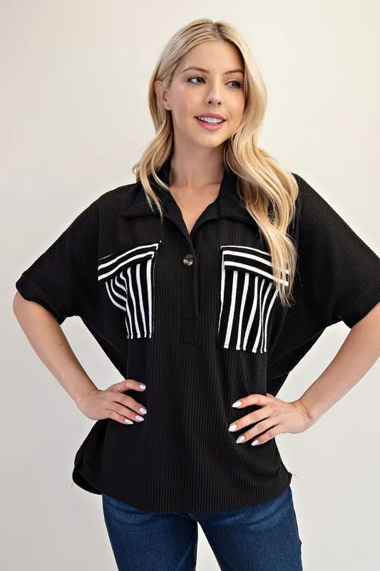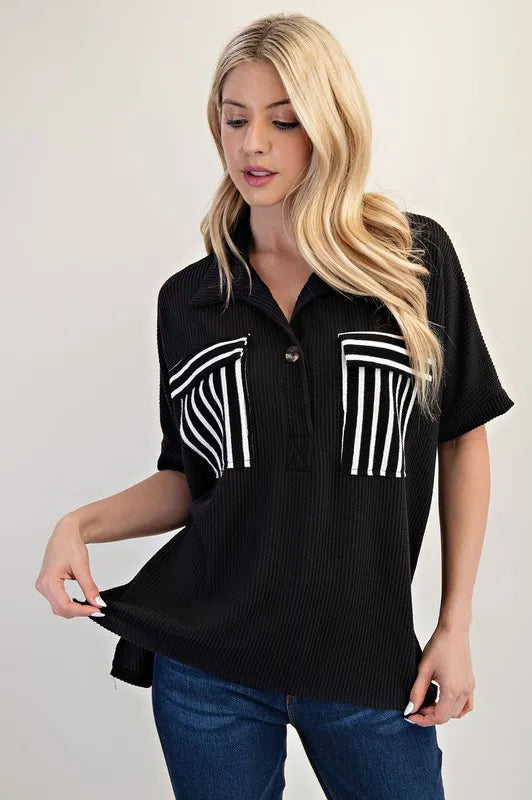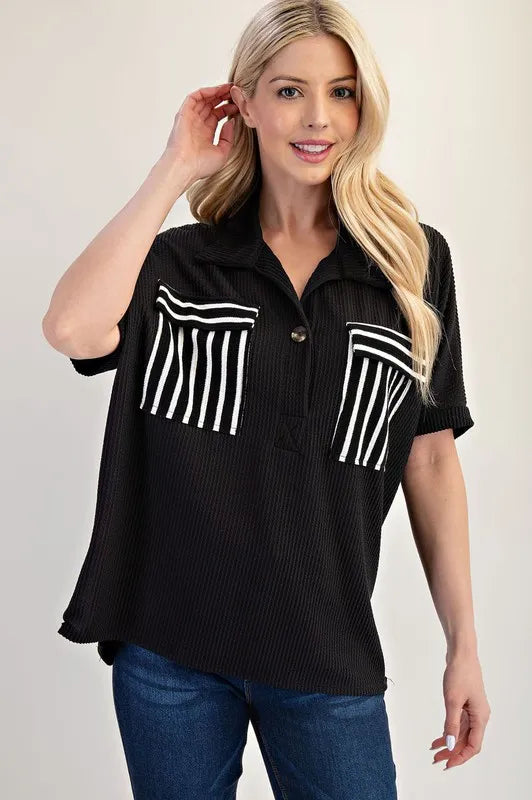 Celeste Full Size Rib Knit Collared Top with Striped Pockets Plus Size