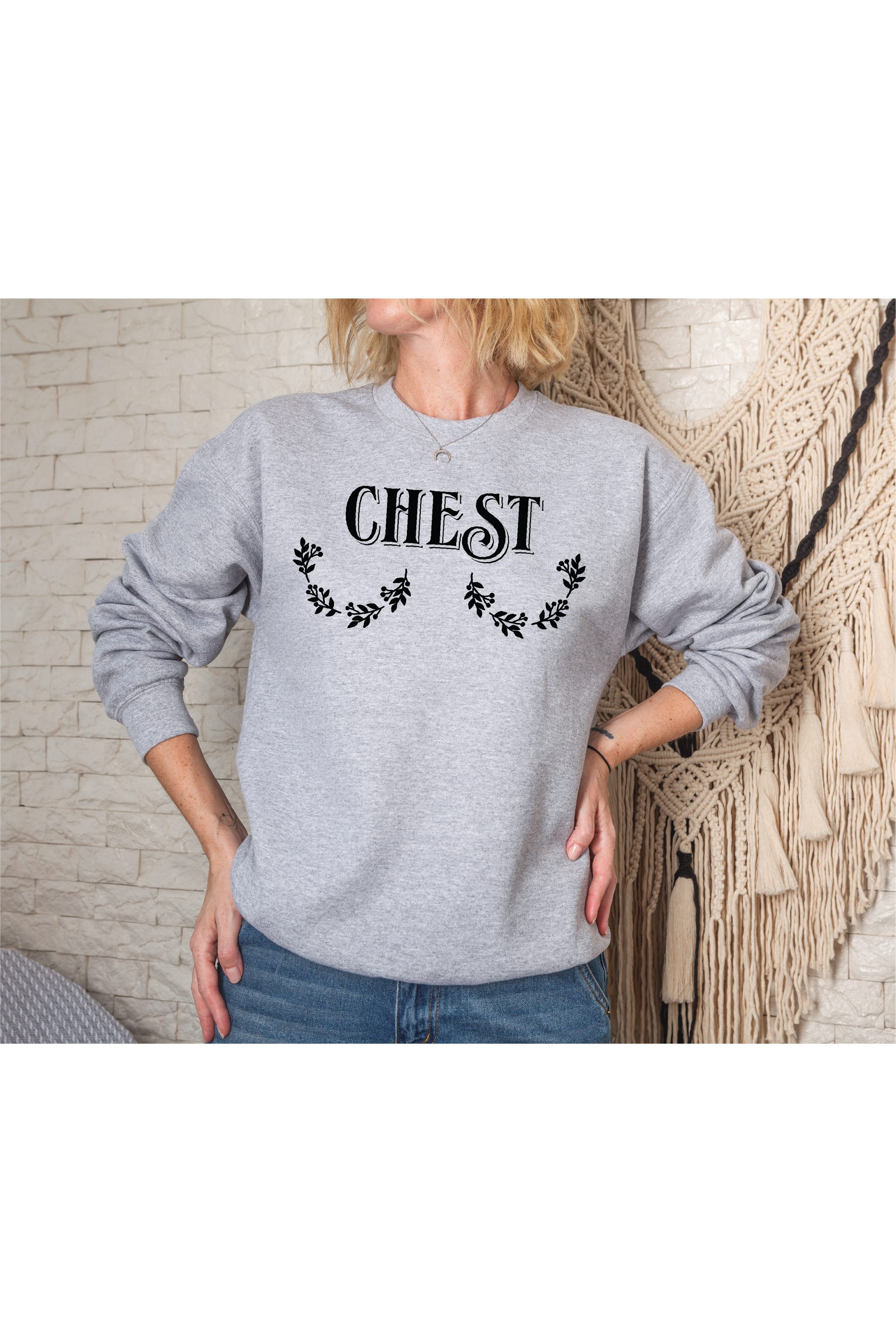 You need a partner for this humorous sweatshirt. This design has "Chest" and grab your significant other to wear the "Nuts" Crewneck!