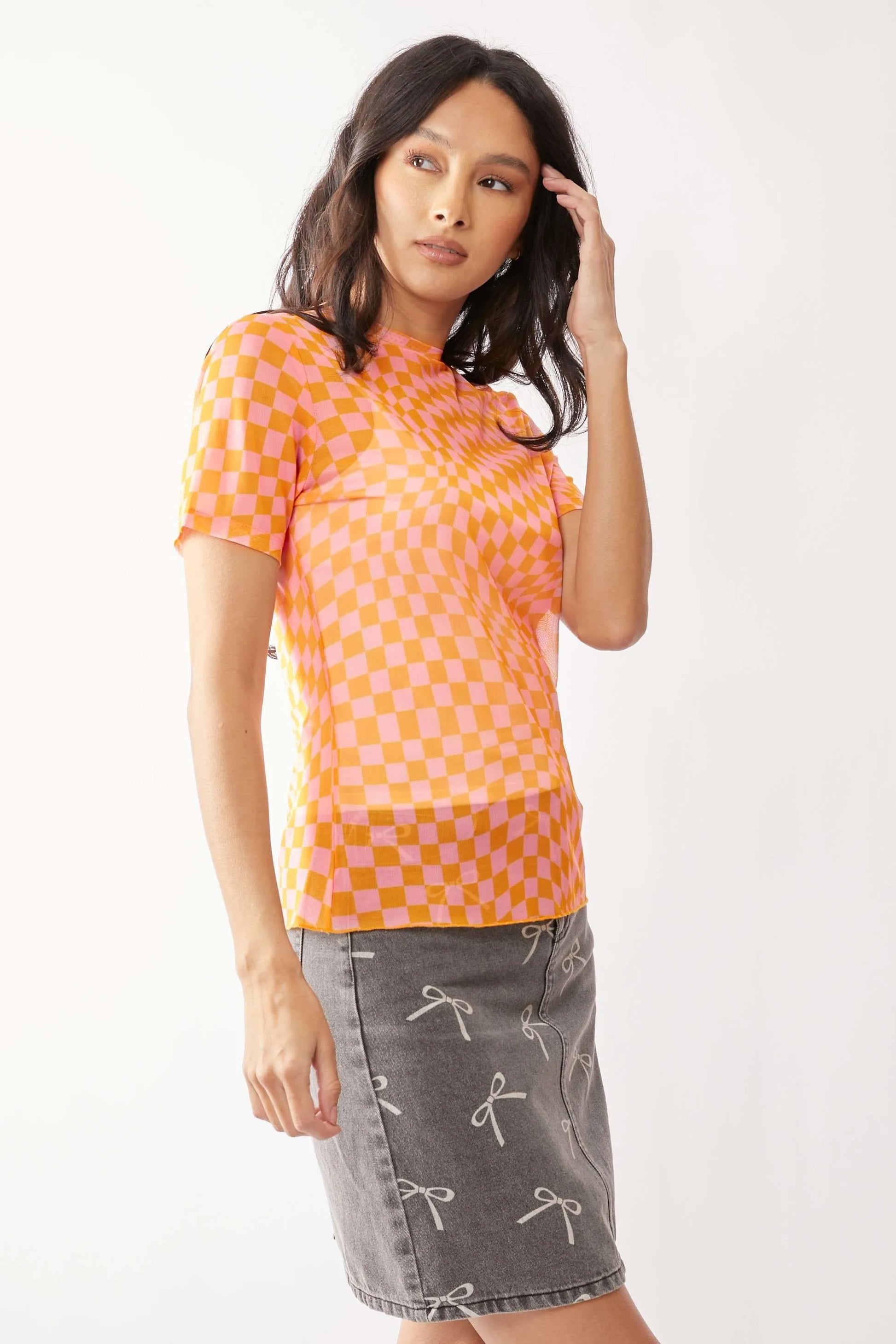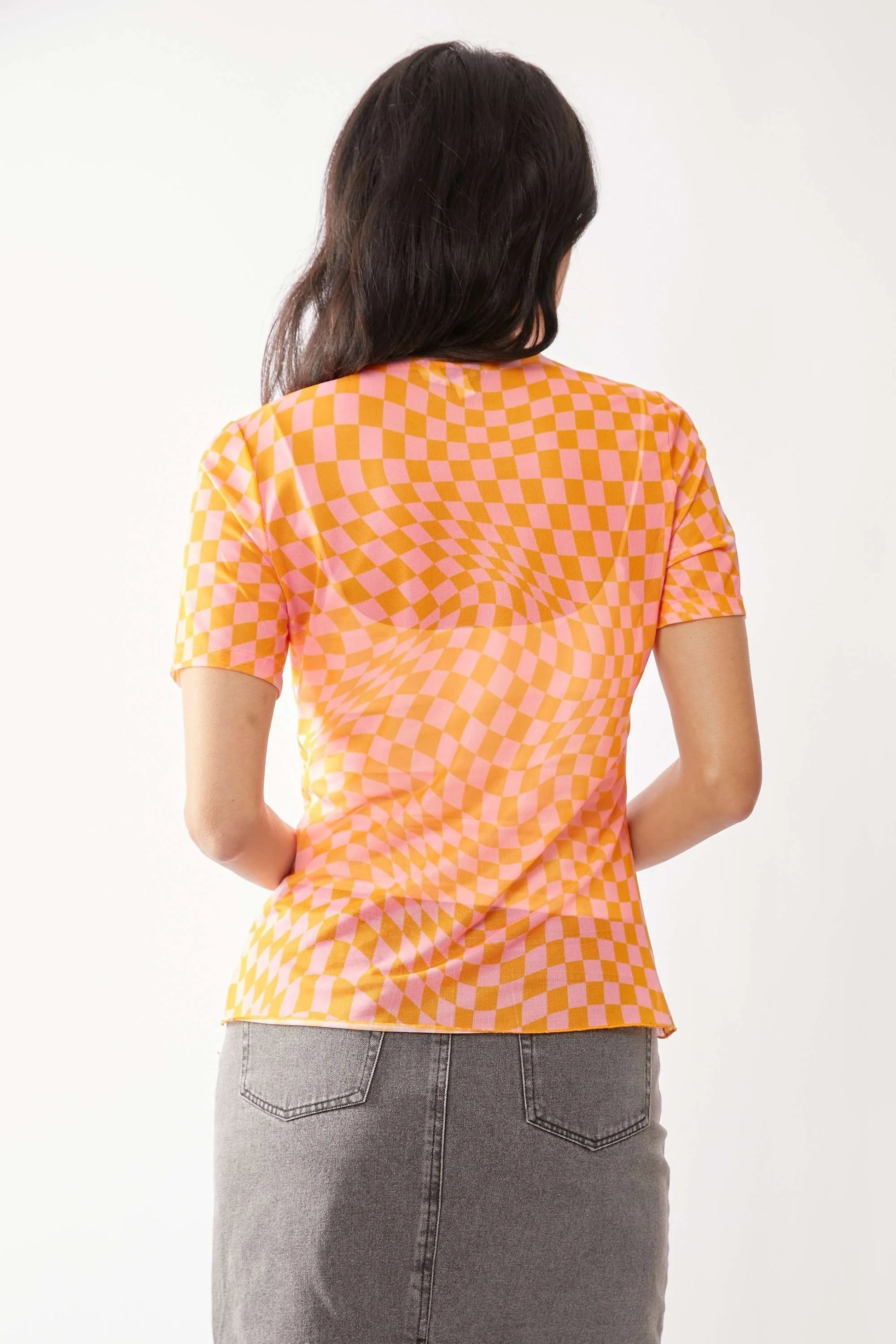 Davi & Dani Checker Board Printed Mesh Short Sleeve Top