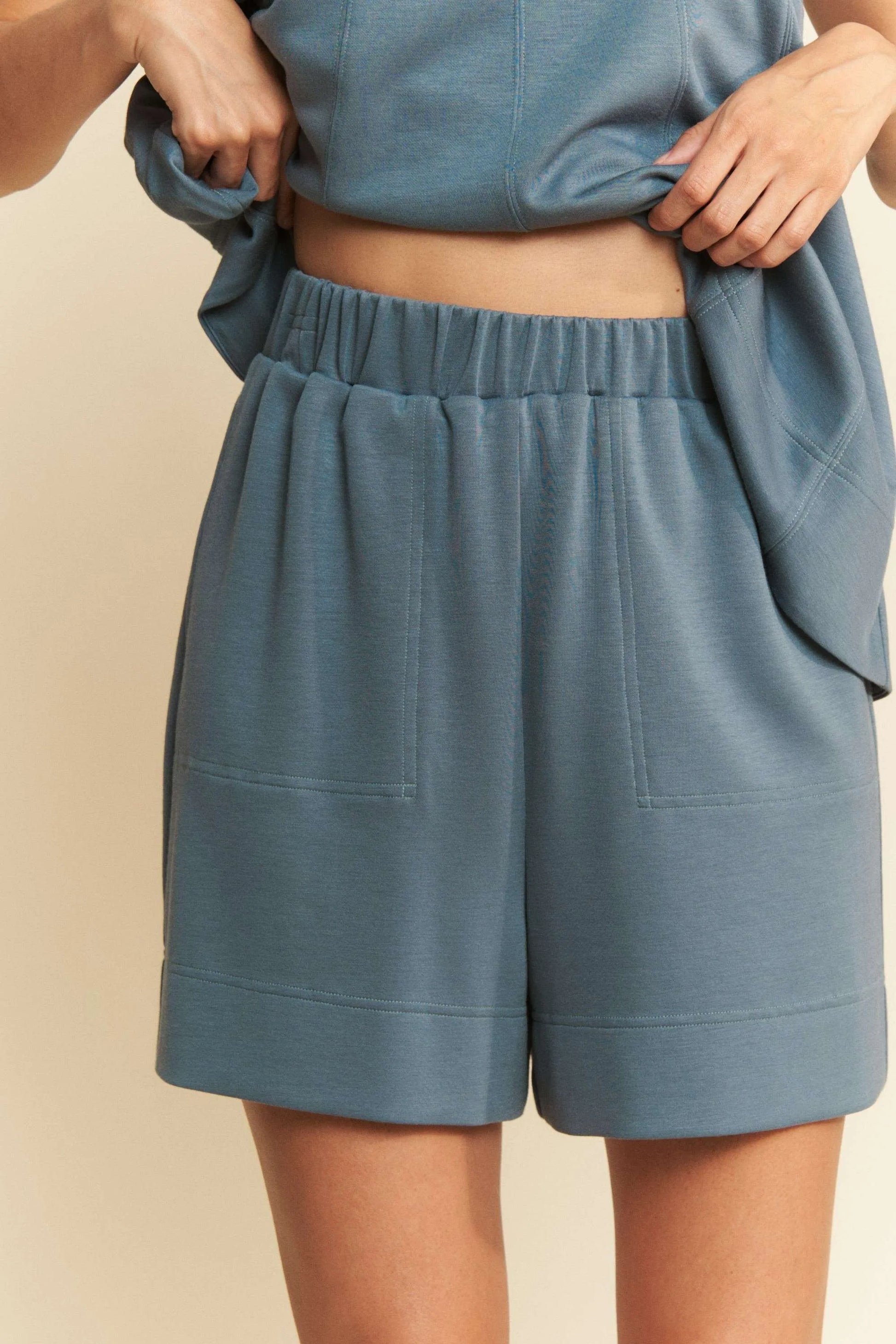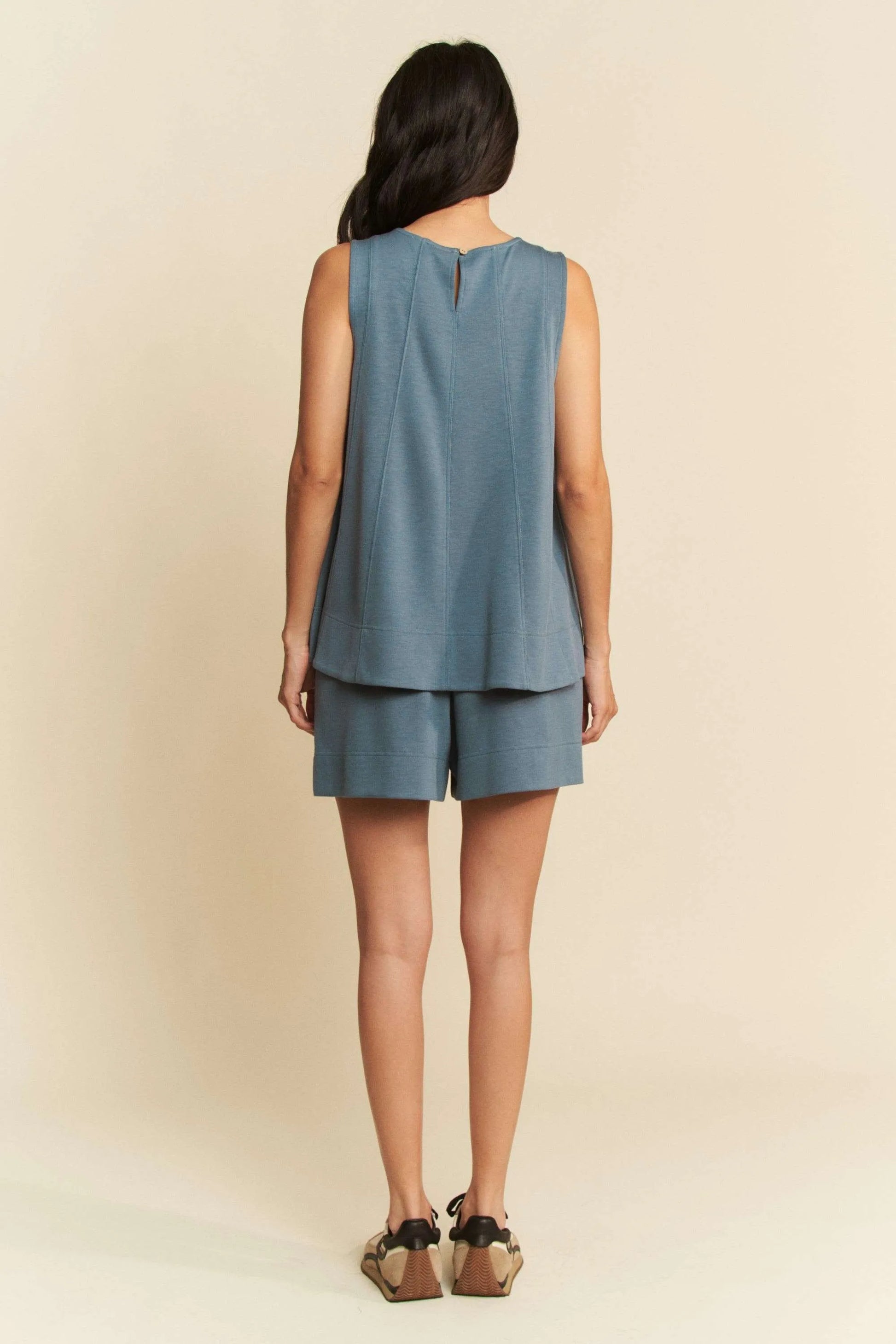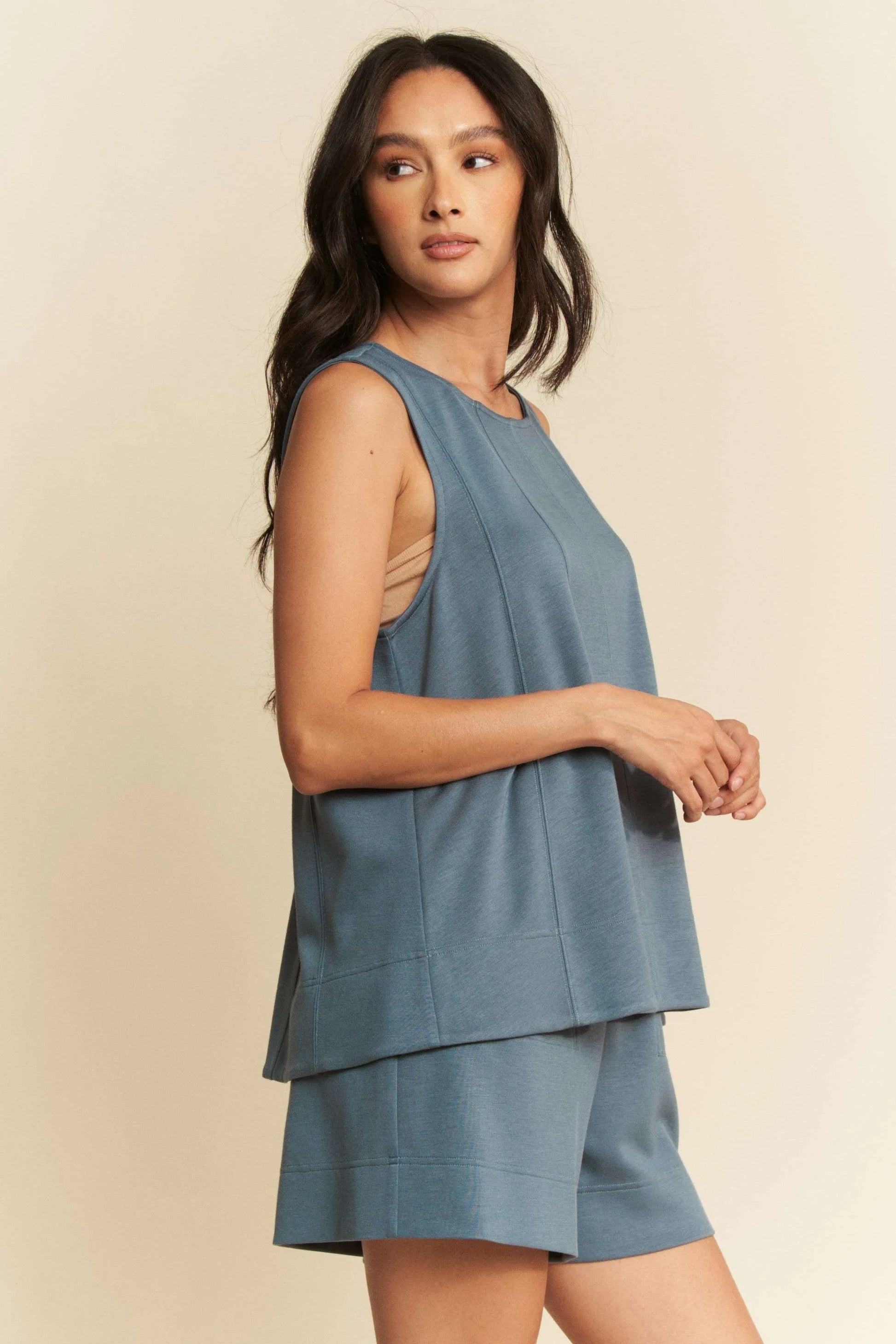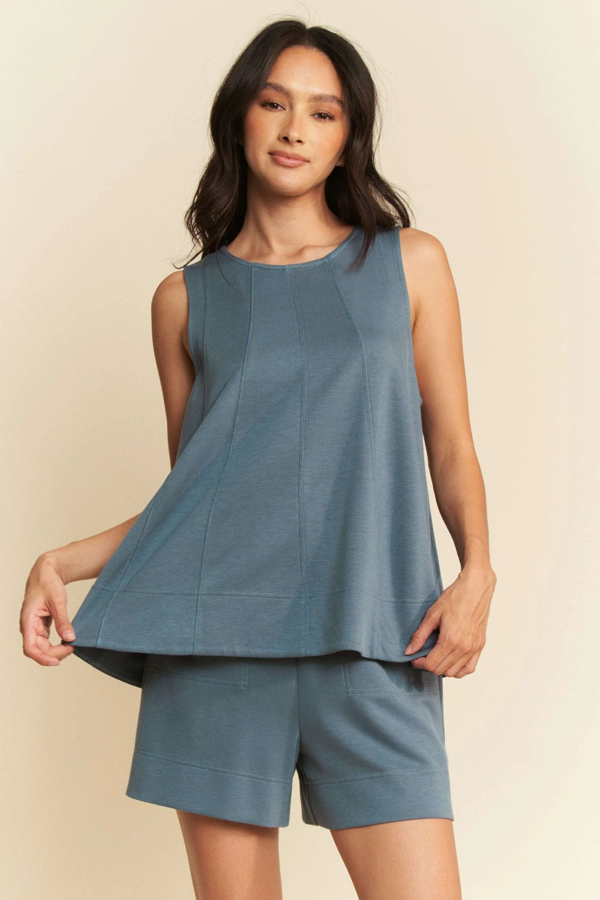 This stylish two-piece loungewear set features a relaxed-fit sleeveless tank top with a flattering A-line silhouette paired with comfortable matching shorts. Crafted from soft ribbed knit fabric in a sophisticated dusty blue shade, the set offers both comfort and style. The tank top showcases subtle seaming details for added visual interest, while the shorts feature an elastic waistband for easy wear. Perfect for relaxing at home, running errands, or casual summer outings. The breathable material ensures all-day comfort while maintaining a put-together appearance.