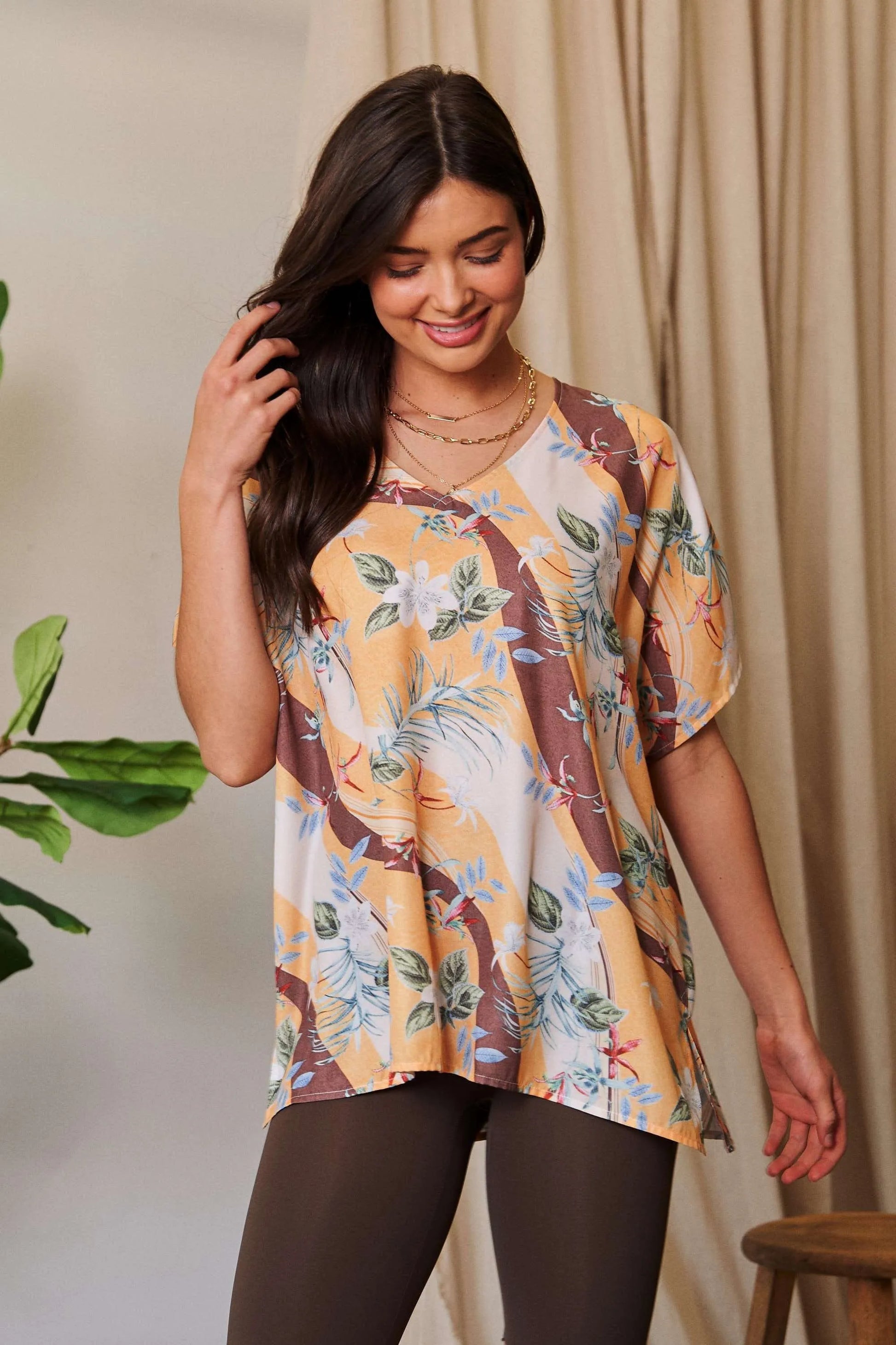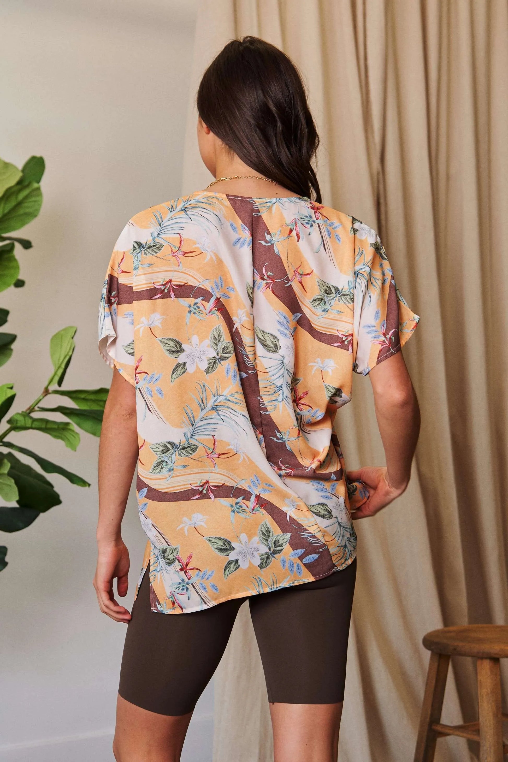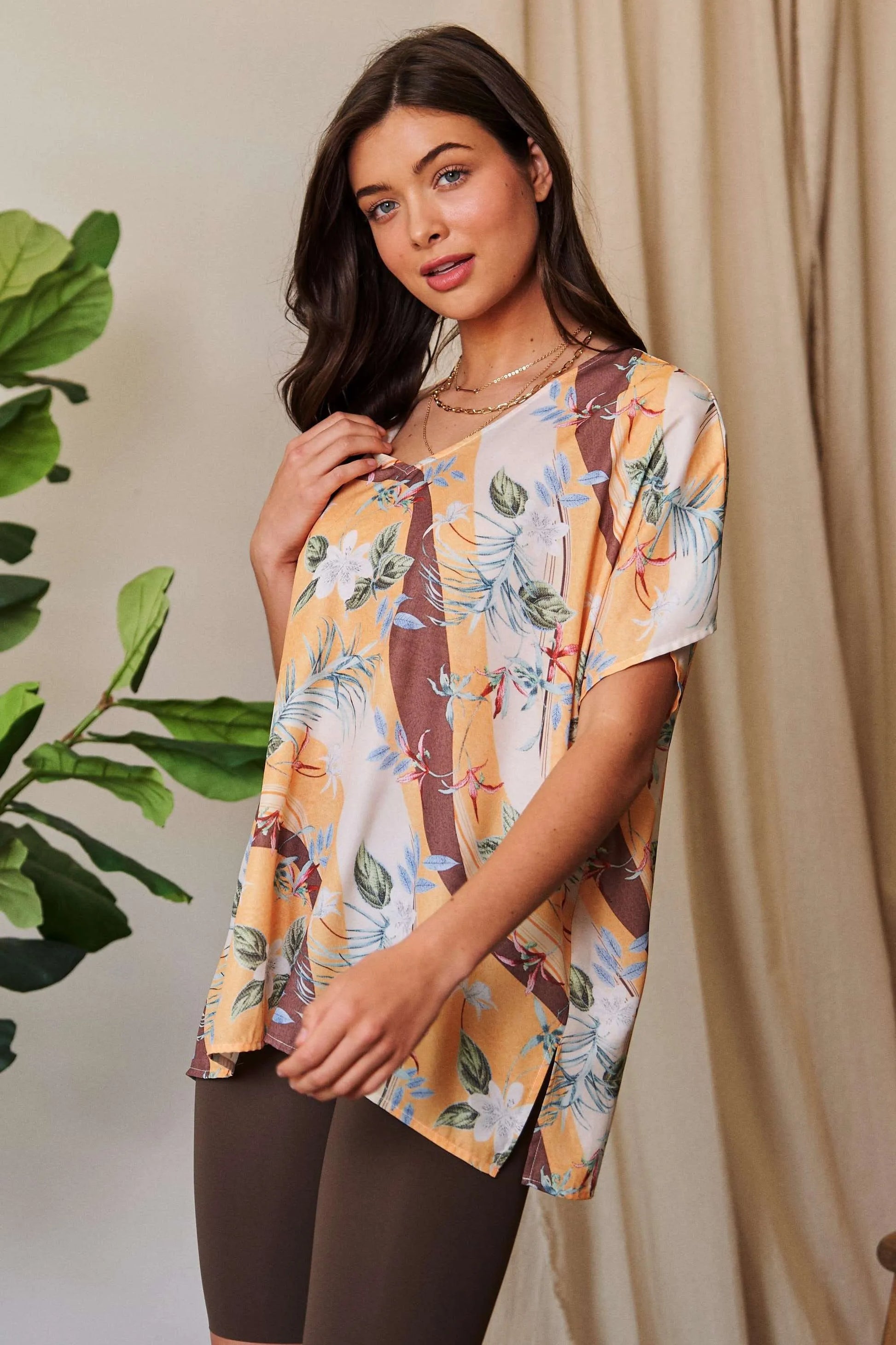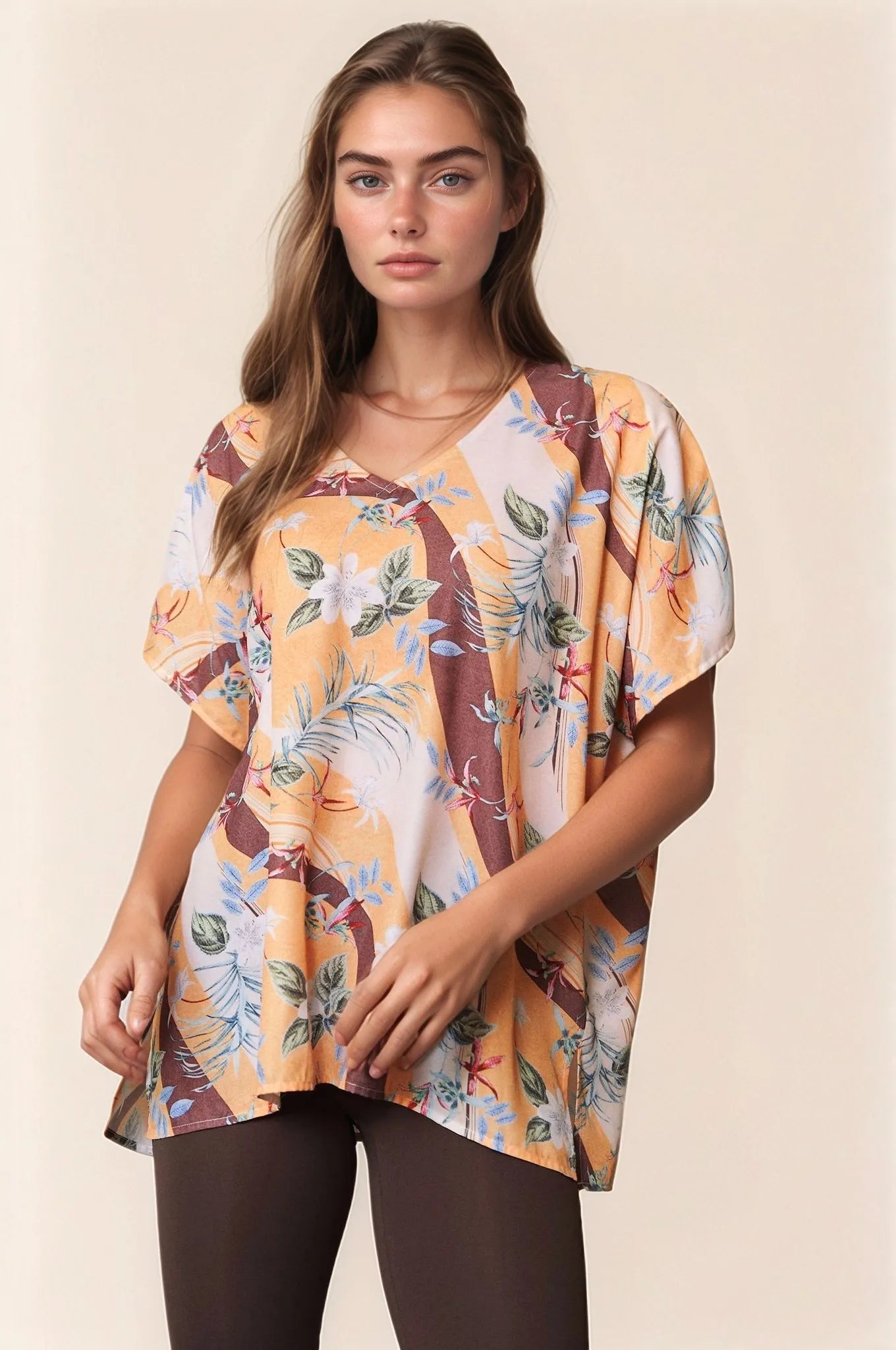This stunning oversized blouse features a captivating tropical floral print in soft peach, purple, and blue tones. Made from lightweight, flowing fabric that ensures comfort and style. The relaxed silhouette is enhanced by flutter sleeves and a flattering V-neckline. Perfect for both casual and semi-formal occasions, this versatile piece can be paired with pants, skirts, or shorts. The botanical print combines large leaf motifs with delicate floral elements, creating a balanced and eye-catching design. Ideal for warm weather and resort wear, this blouse offers both comfort and sophisticated style.