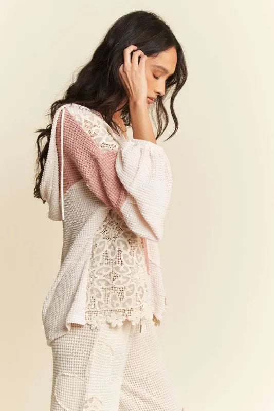 This hoodie combines comfort with a touch of femininity through its lace panel detailing. The flower patch adds a charming and playful element to the overall design. Perfect for adding a romantic twist to your casual outfits. Pair it with jeans and sneakers for a stylish and effortlessly chic look.