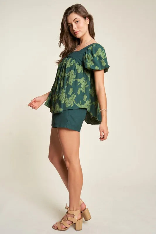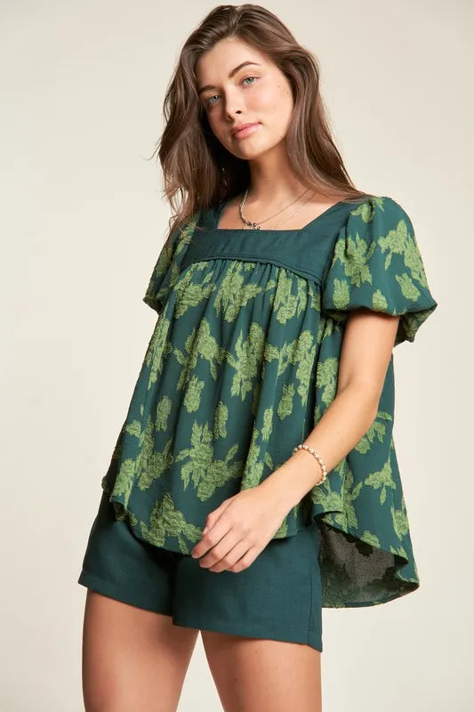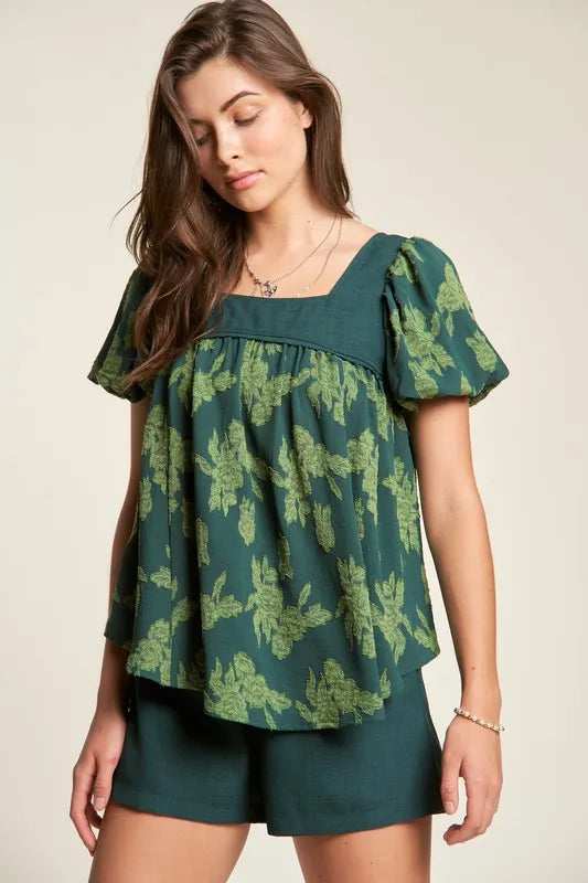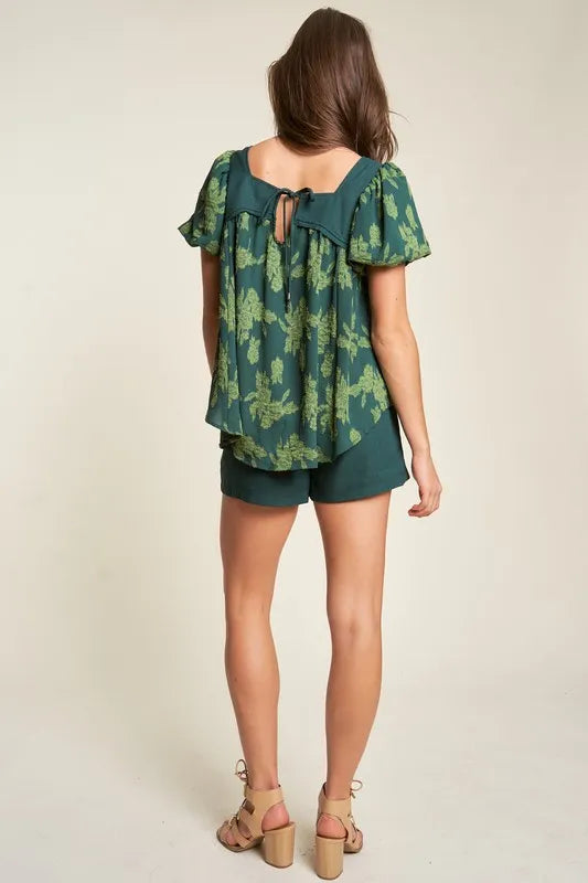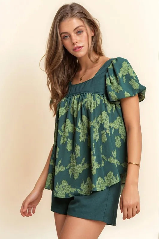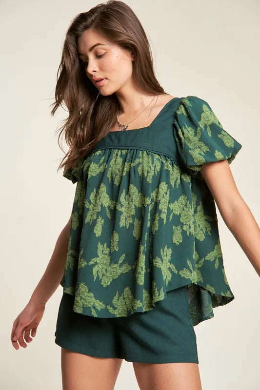 Davi & Dani Nature Printed Square Neck Puff Sleeve Blouse