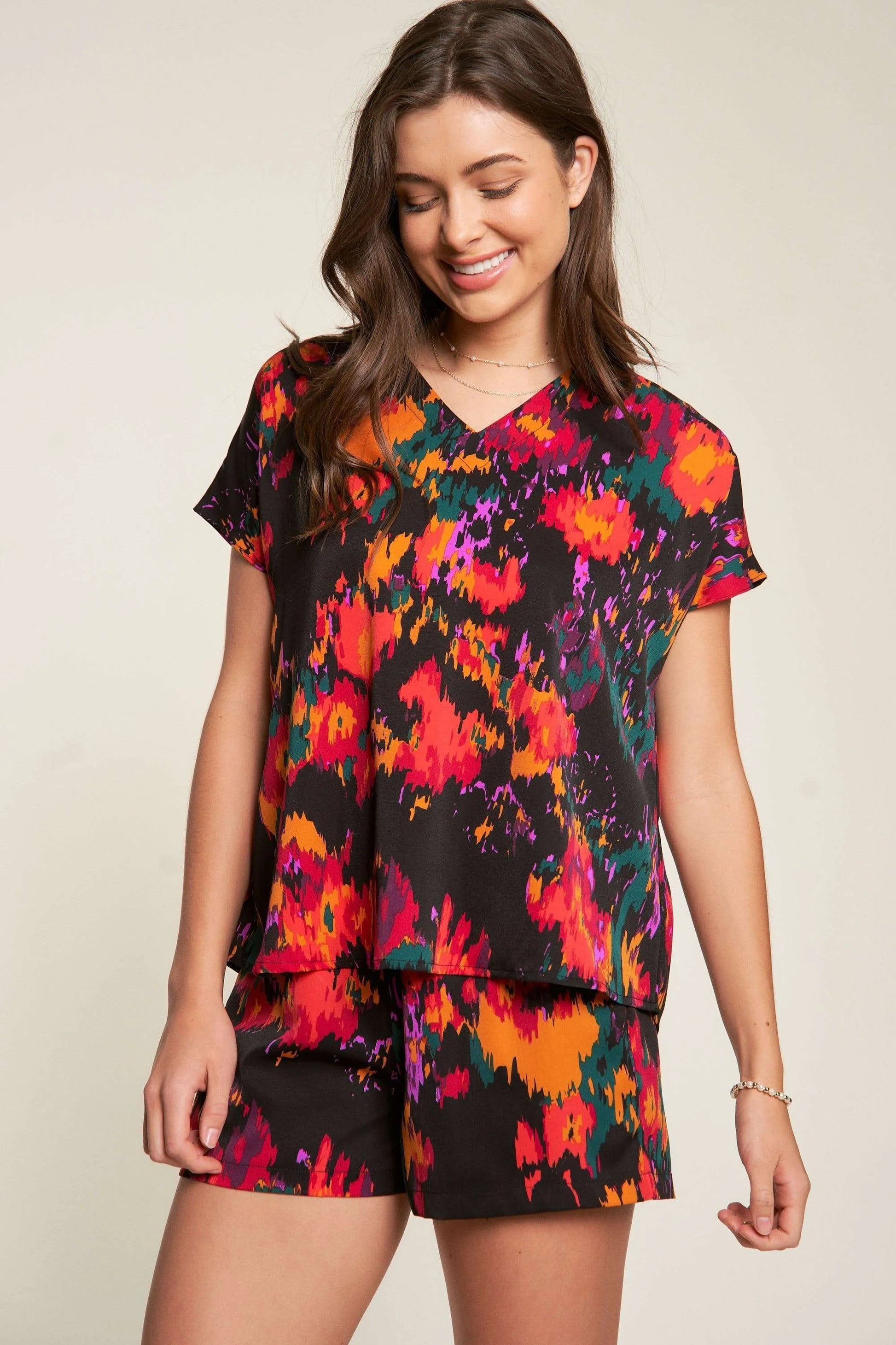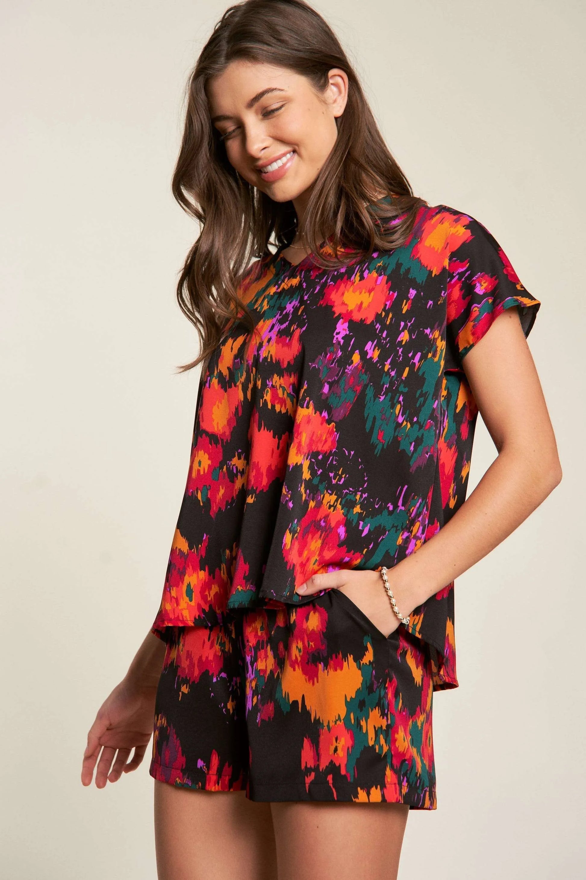This fashionable loungewear set features a stunning tie-dye print in vibrant colors including red, orange, purple, and black. The set includes a relaxed-fit short sleeve top and coordinating shorts, perfect for casual wear or lounging. Made from soft, comfortable fabric that allows for easy movement. The modern abstract print pattern creates a unique and eye-catching appearance. The shorts feature an elastic waistband for comfort, while the top has a classic crew neckline and casual cut. Ideal for both indoor relaxation and casual outings.