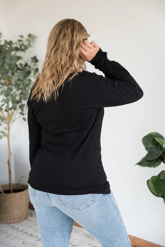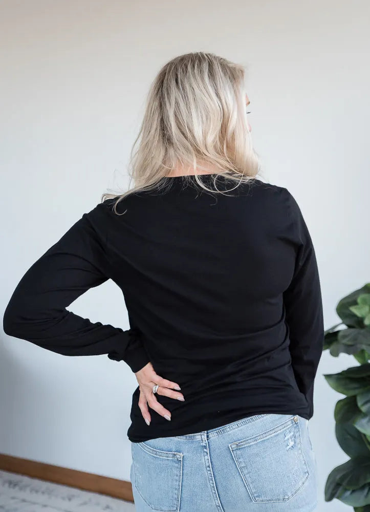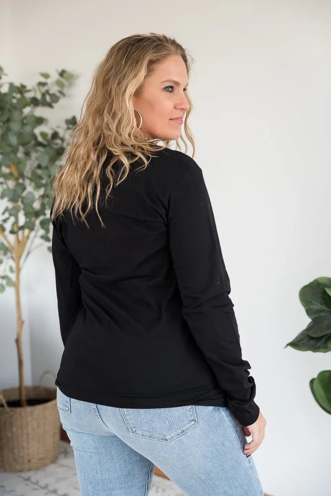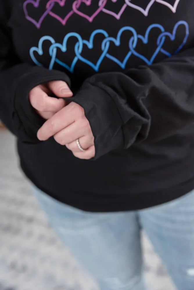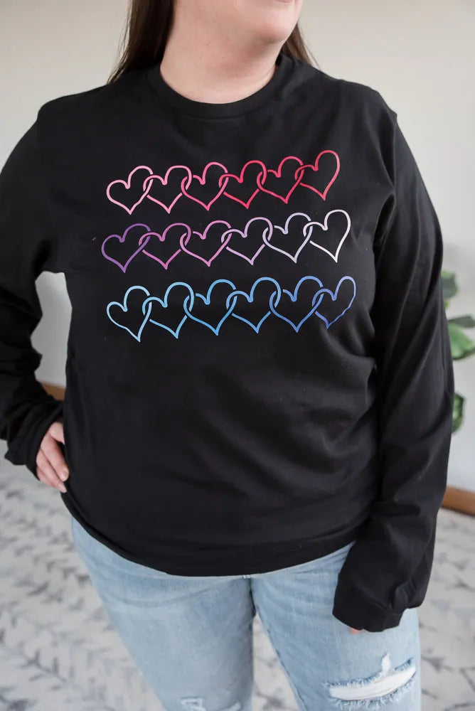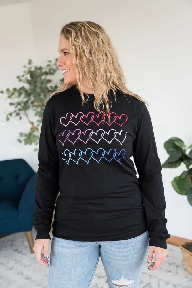 Celebrate love this Valentine's Day and year round in this beautiful graphic long sleeve tee! The overlapping hearts are an array of colors making it perfect for wearing on its own or layering with a solid cardigan. Pair with your favorite pair of denim any day of the week.