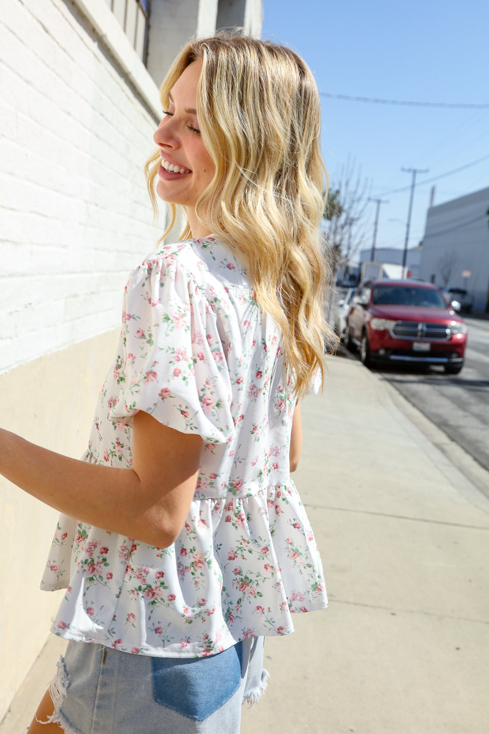 Designed with silky ribbon bow ties and a vintage floral fabric, this woven babydoll top with folded puff sleeves is versatile and will brighten up any room or occasion you wear it to. Be prepared to stun!