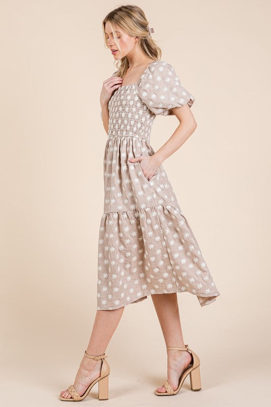 The "Floral Embroidered Smocked Puff Sleeve Tiered Midi Dress" is a charming and stylish dress with intricate floral embroidery, a smocked bodice, puff sleeves, and tiered layers. This midi dress exudes a feminine and romantic vibe with its delicate floral details and tiered design. Perfect for various occasions, this dress offers a fashionable and elegant option for your wardrobe. Embrace a whimsical and chic look with this lovely floral embroidered midi dress.