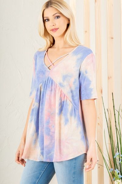 Heimish Full Size Crisscross Tie Dye Babydoll Top Plus Size