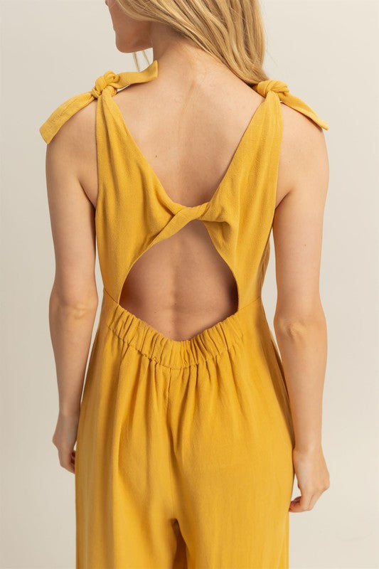 The "Cutout Back Knotted Strap Wide Leg Jumpsuit" is a stylish one-piece outfit featuring a trendy cutout back design with knotted straps. The wide leg silhouette offers a fashionable and comfortable fit, perfect for various occasions. This jumpsuit combines modern style with a touch of sophistication, making it a versatile addition to your wardrobe.