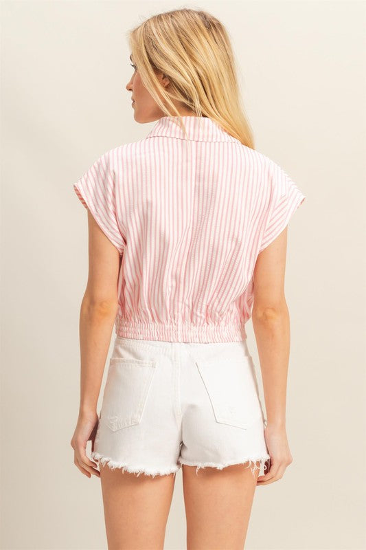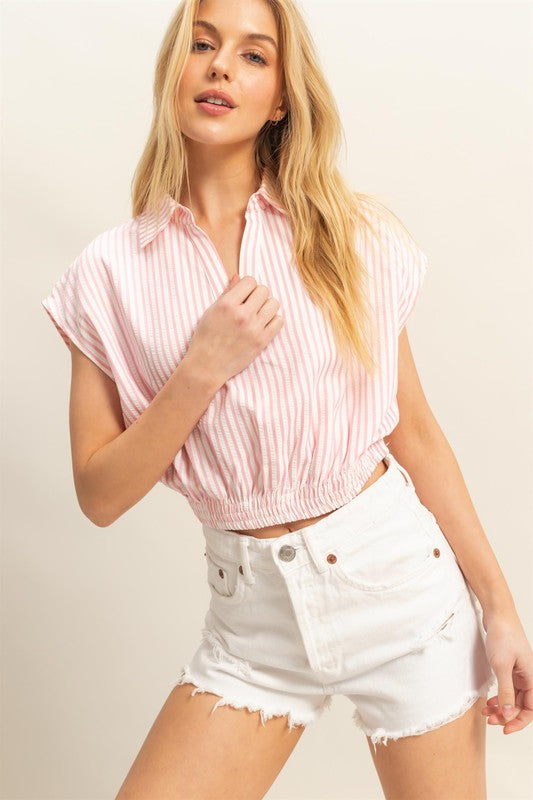 HYFVE Striped Elastic Hem Johnny Collar Cap Sleeve Blouse