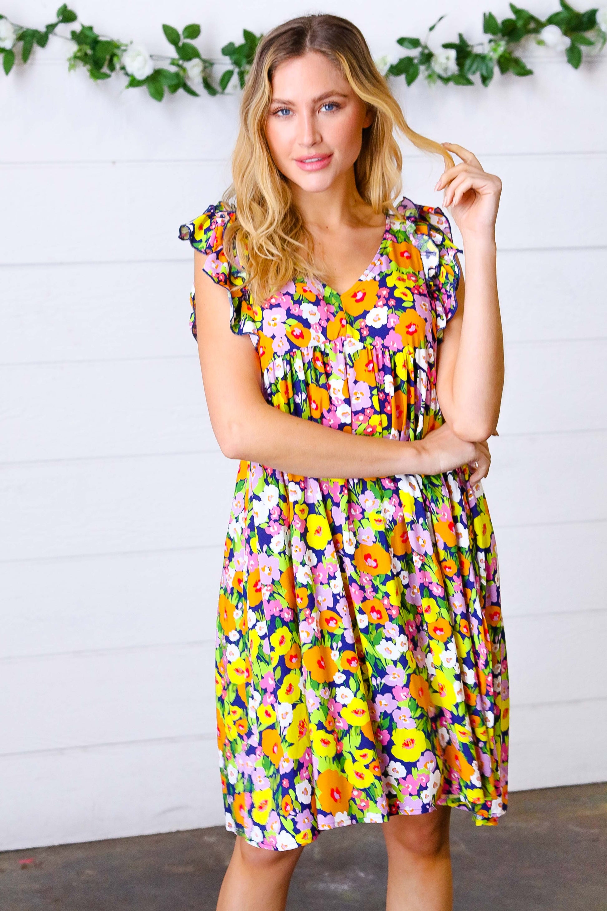 Fall in love with this beautiful indigo flat floral print woven dress featuring a flattering waistline and V neck. With a fit and flare design, cozy side pockets and ruffle sleeves, wear for any occasion, day or night!