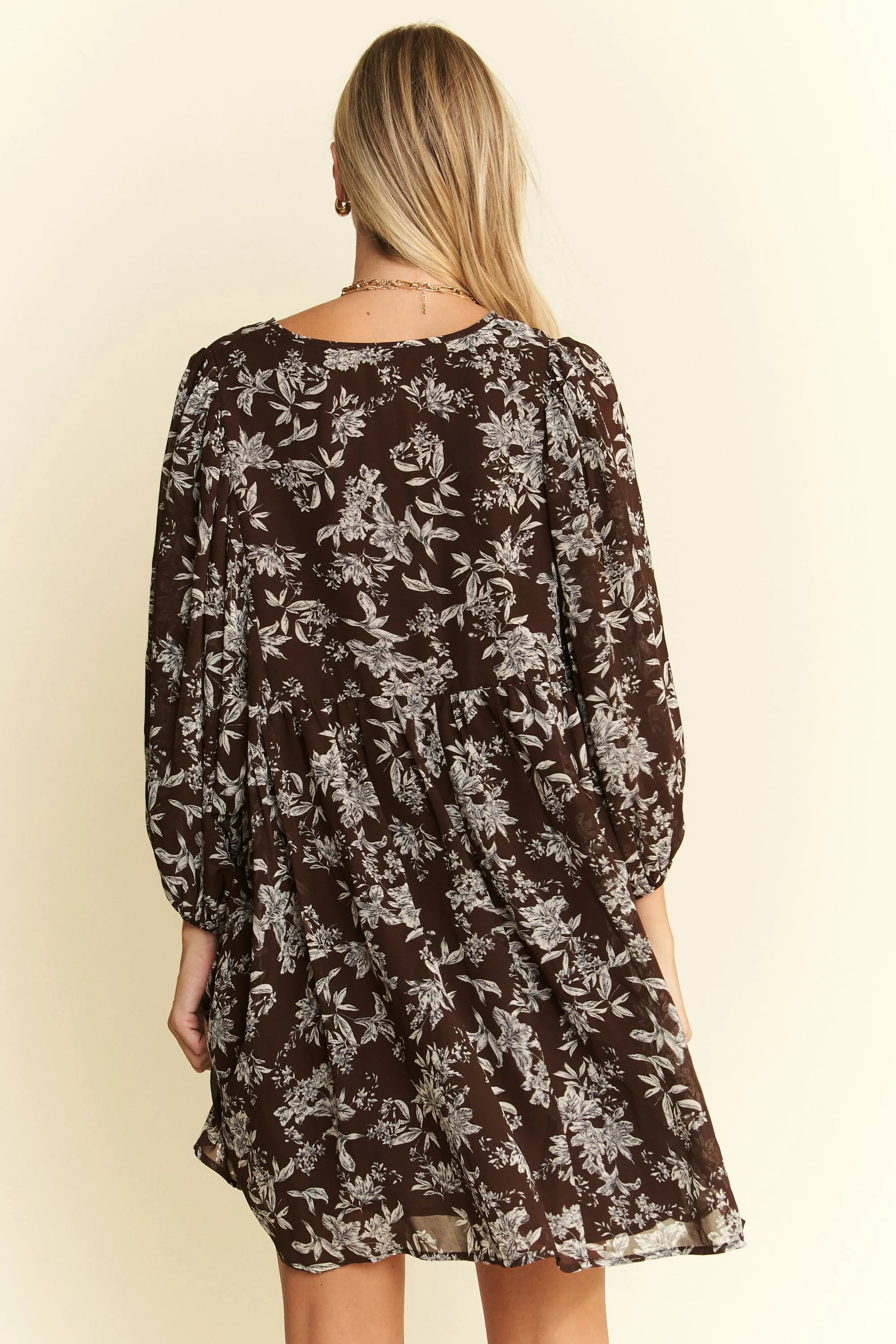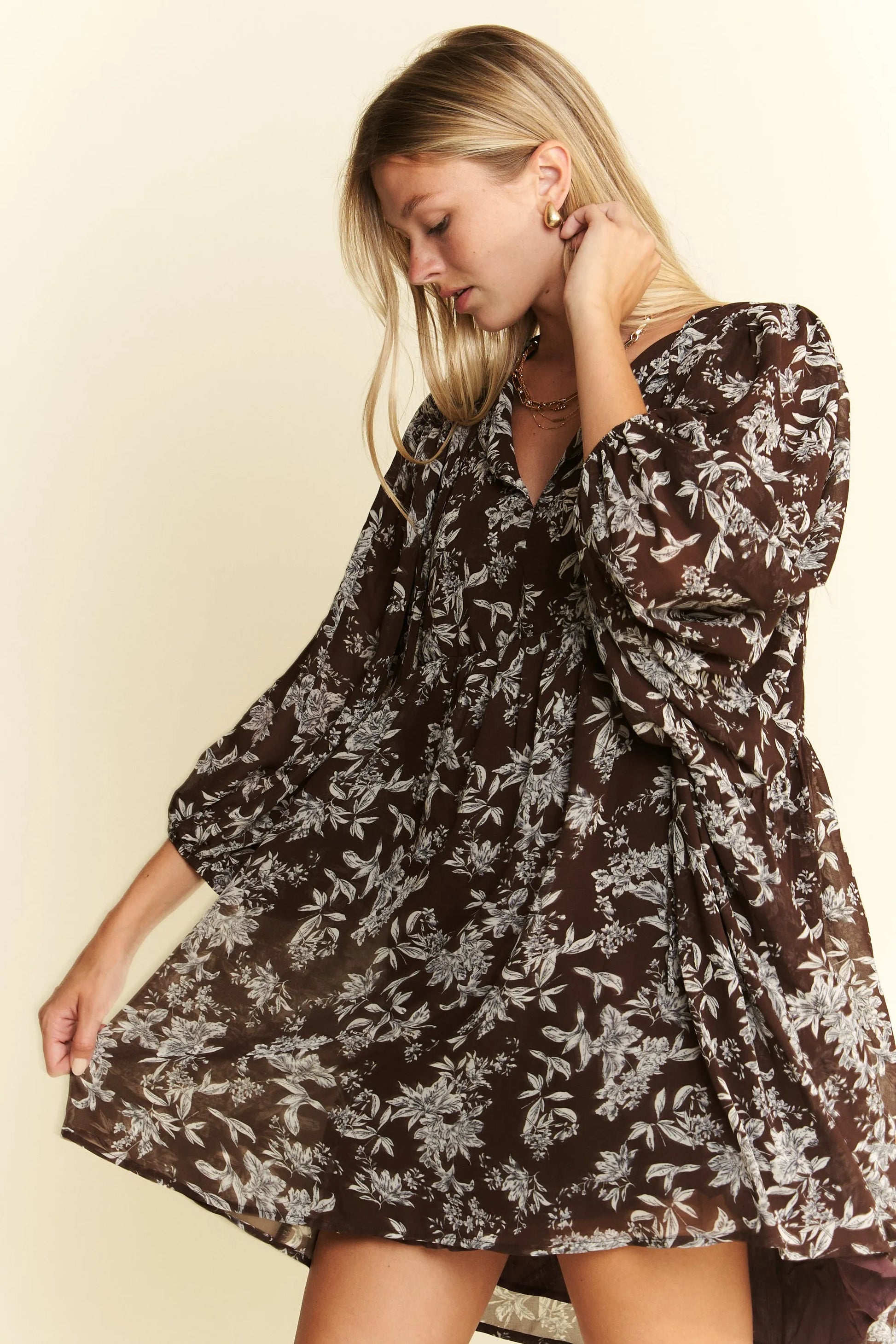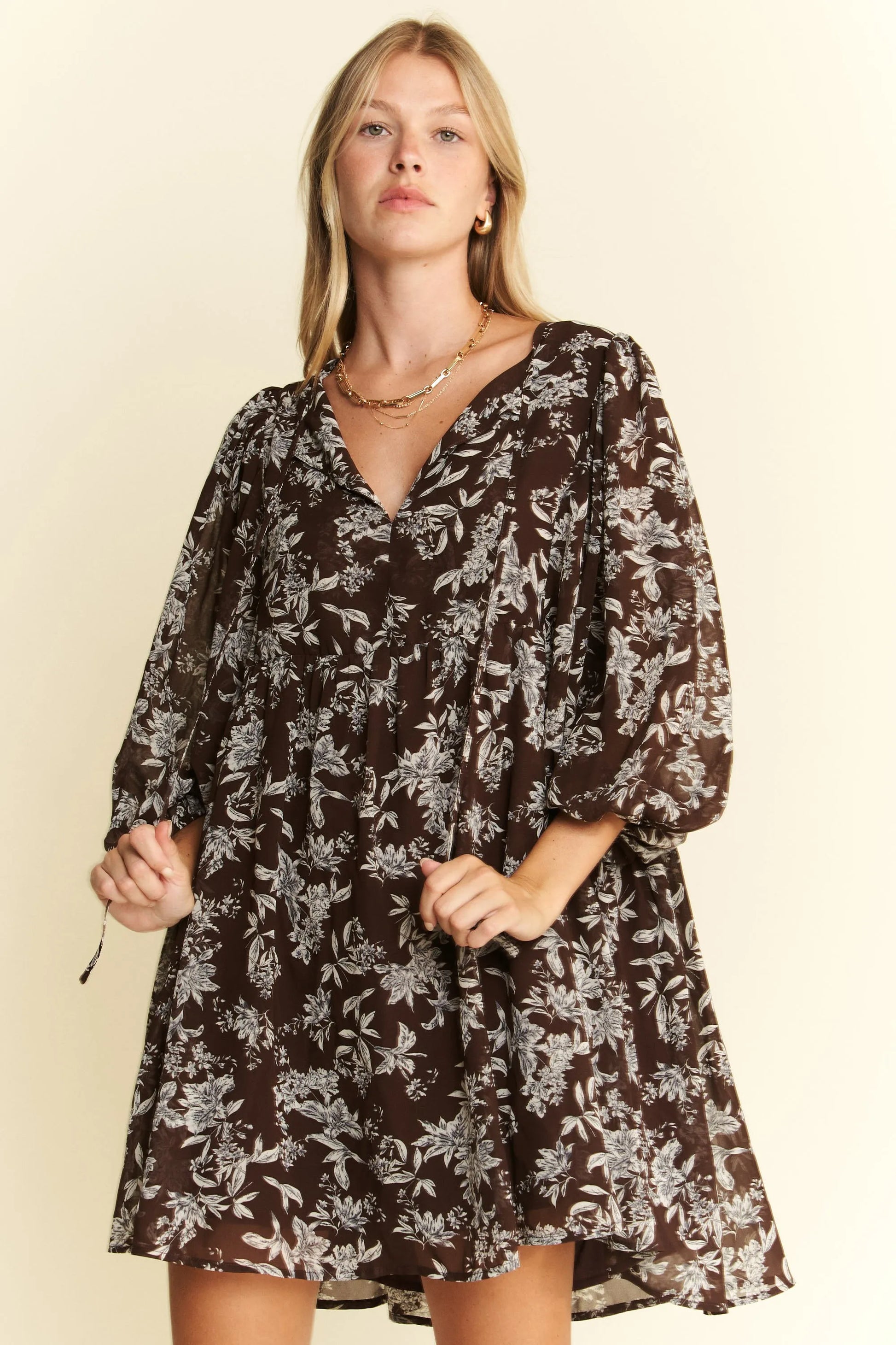 This charming mini dress features a delicate floral print on a dark background, creating an elegant and versatile piece. Made from flowing chiffon fabric, it offers both comfort and style. The balloon sleeves add a romantic touch while the V-neckline creates a flattering silhouette. The loose, flowy fit makes it perfect for various occasions from casual daytime wear to evening events. The dress combines modern styling with bohemian elements, suitable for multiple seasons. The lightweight fabric ensures comfort while maintaining a sophisticated appearance.
