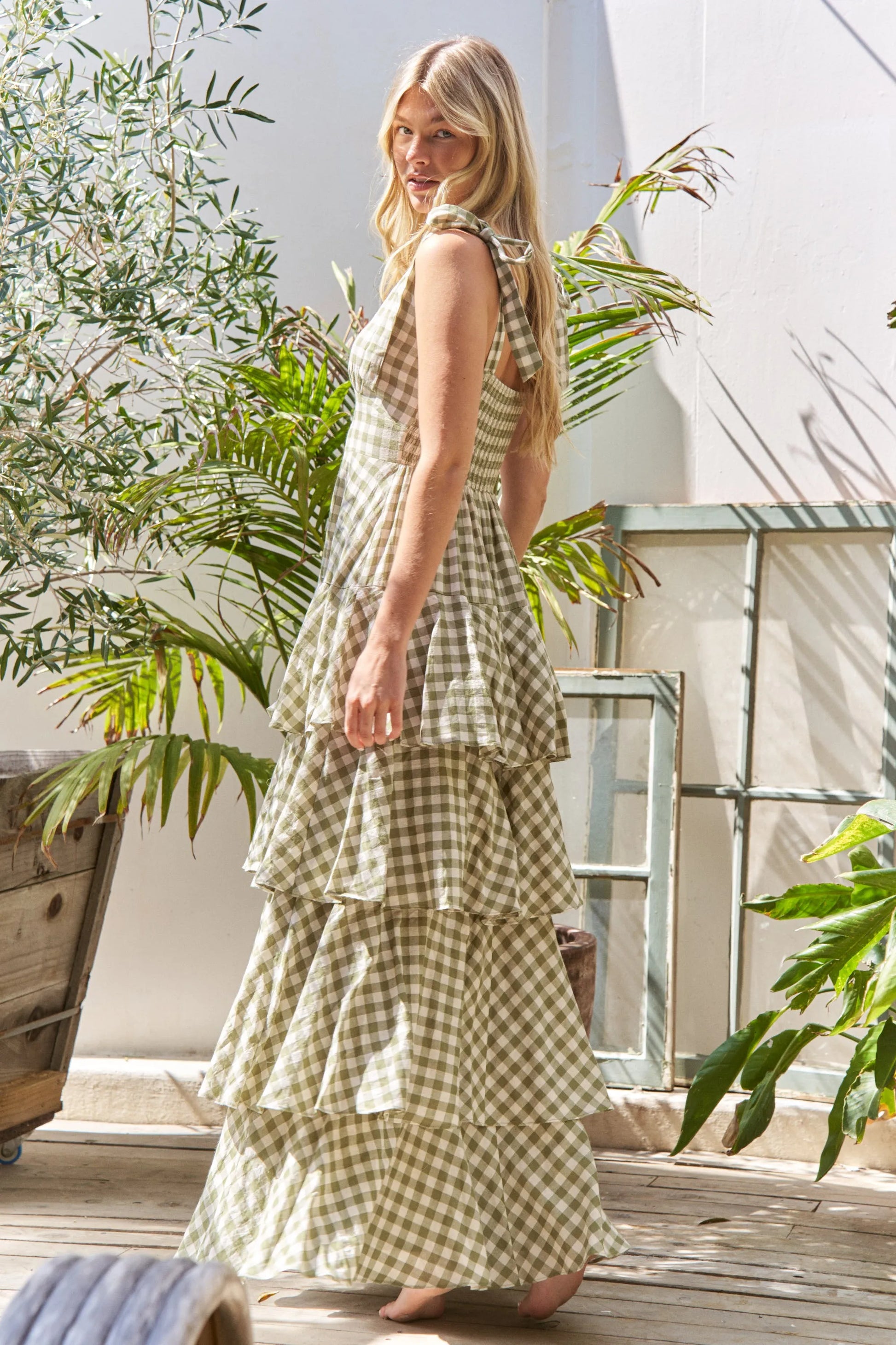 This charming maxi dress features a classic gingham check pattern in sage green and white, perfect for warm-weather occasions. The design incorporates romantic elements like a deep V-neckline, shoulder ties, and cascading ruffle tiers that create movement and drama. Made from lightweight fabric suitable for spring and summer wear, the dress includes a daring side slit and fitted bodice that transitions into a flowing skirt. The sleeveless cut and wrap-style top provide a flattering fit, while the vintage-inspired pattern adds a timeless appeal. Ideal for garden parties, outdoor events, or casual dressy occasions.