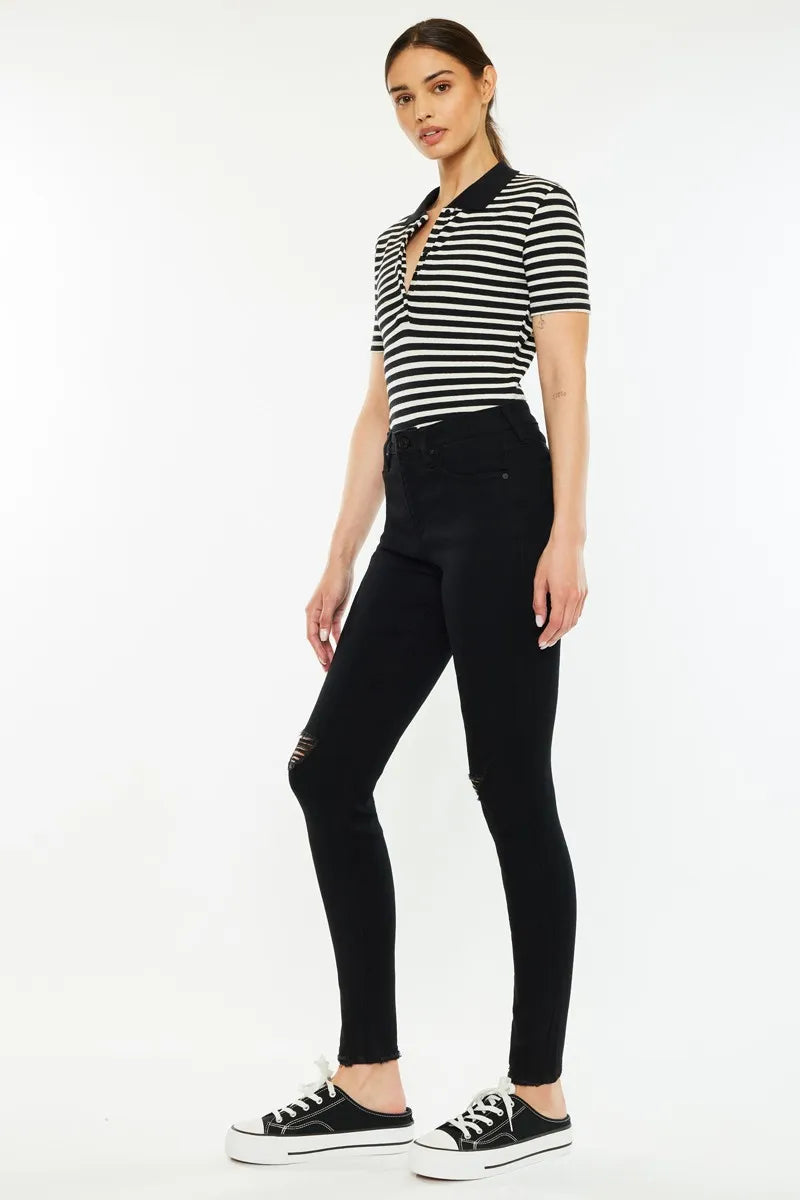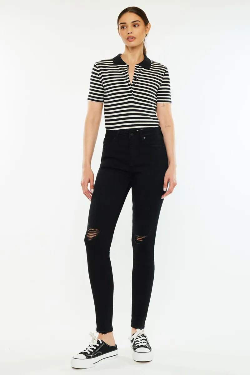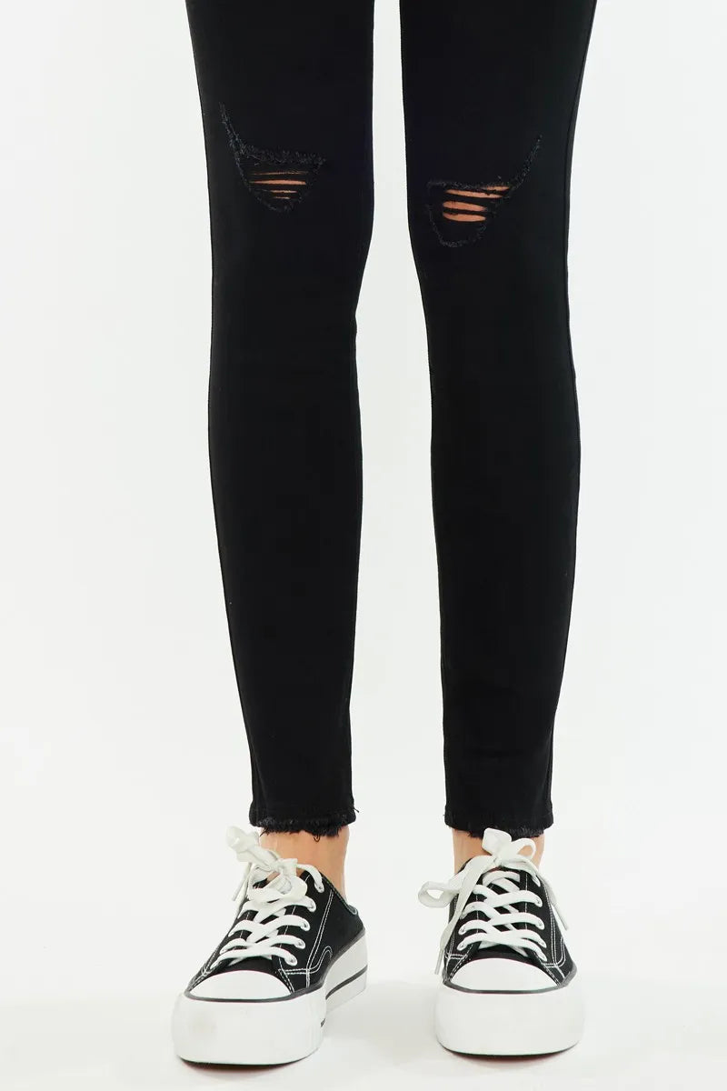 The Distressed High Rise Super Skinny Jeans are a must-have for a sleek and edgy look. With a high rise waist and super skinny fit, they provide a flattering and modern silhouette. The distressed detailing adds a touch of rugged charm to these jeans, perfect for adding a bit of attitude to your outfit. Pair them with a graphic tee and boots for a cool and stylish ensemble that will turn heads.