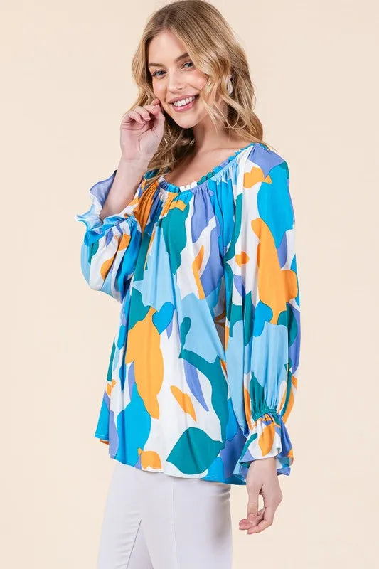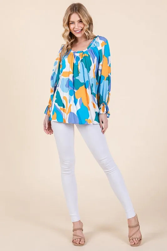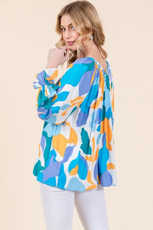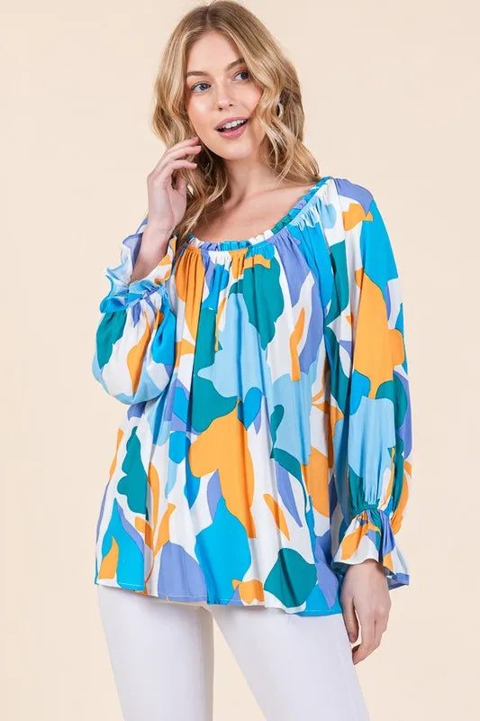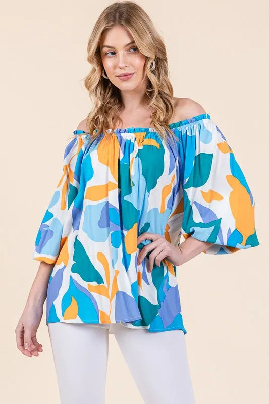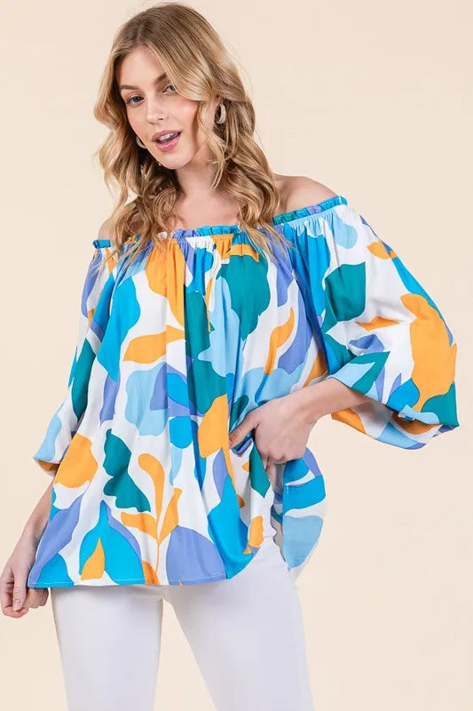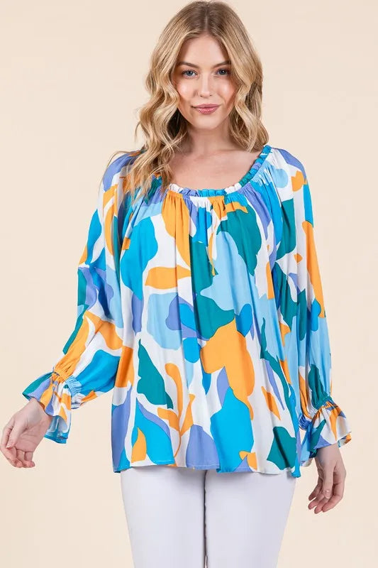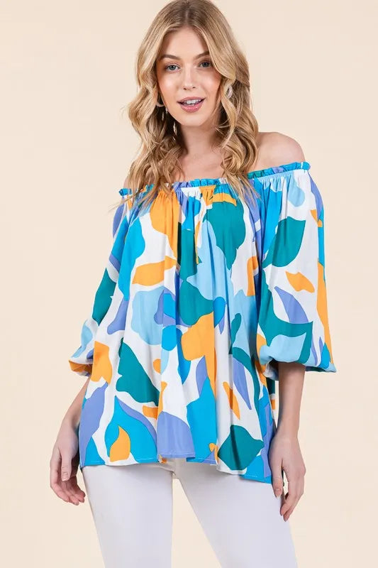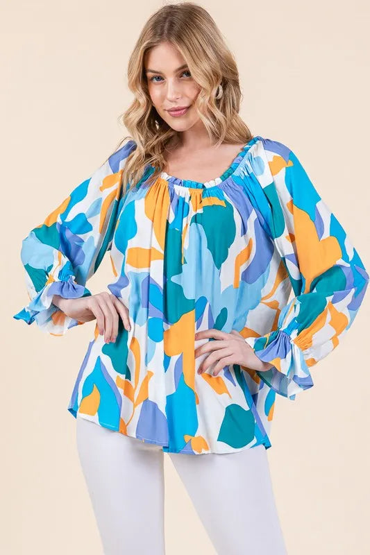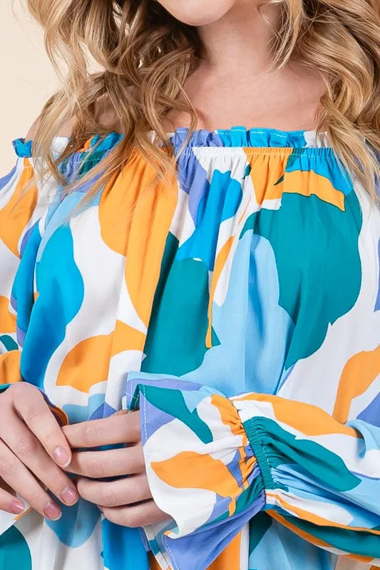 Make a bold statement with this abstract print off-the-shoulder long sleeve top. The abstract print adds a modern and artistic touch to the top. The off-the-shoulder design is chic and trendy, perfect for showcasing your shoulders. Pair with jeans or trousers for a stylish and fashion-forward look. Elevate your outfit with this unique and eye-catching top.