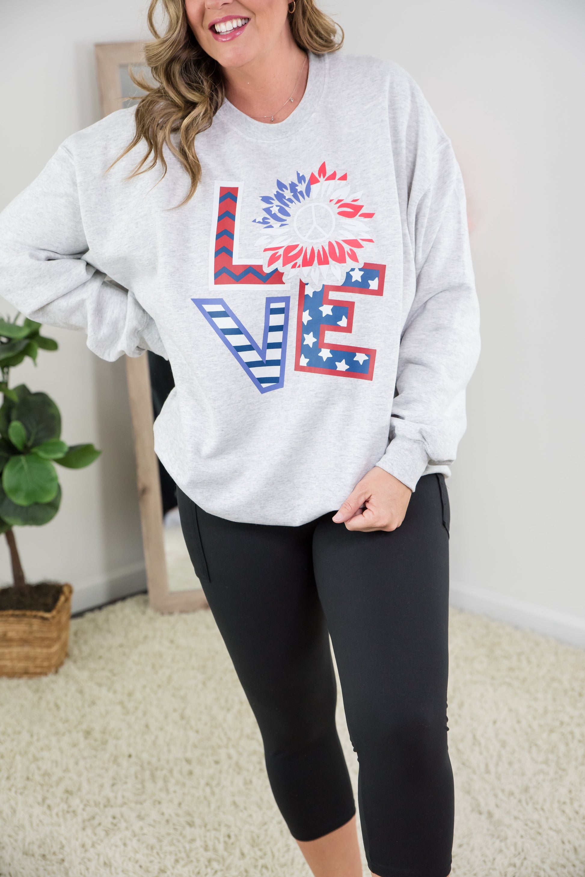 Show your love for the stars and stripes with this cute gray crewneck sweatshirt. Wear it year round with shorts or lounge pants.