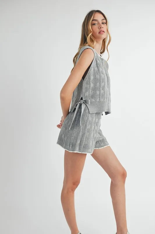 A side tie detail knit vest and shorts set is a stylish and versatile outfit option. The side tie detail adds a trendy touch to a basic knit vest, while the matching shorts create a coordinated look. This set is perfect for warm weather, casual outings, or even lounging at home. You can pair this set with sneakers for a comfy and chic look, or dress it up with sandals or heels for a more polished ensemble. Enjoy styling and rocking this cute set!