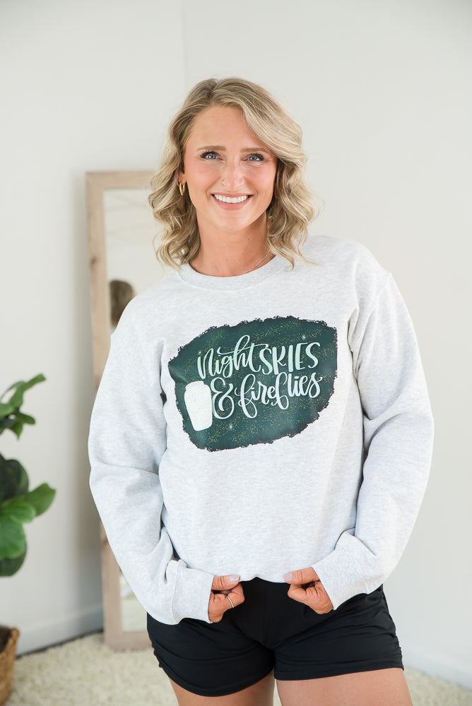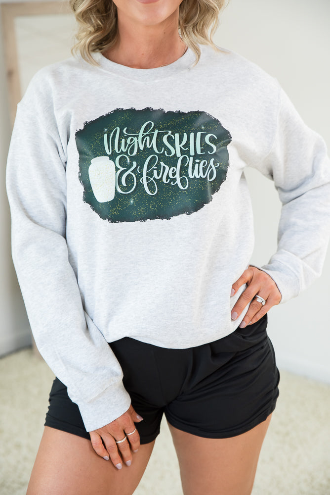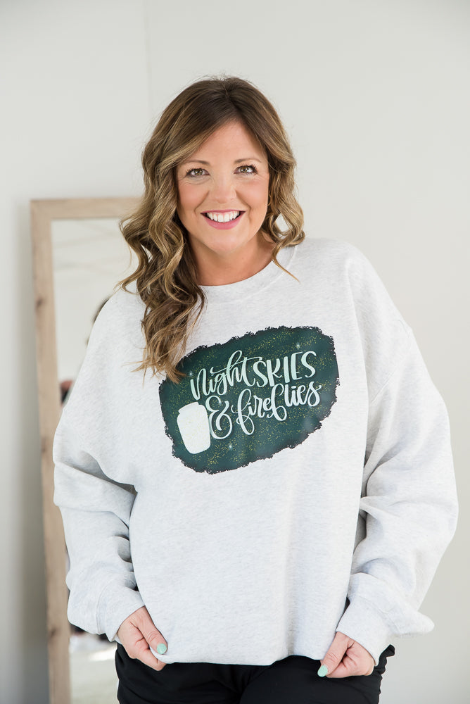 Create amazing memories out under the night sky and chasing fireflies. Wear this gray graphic sweatshirt with lounge pants or our black Harem shorts.