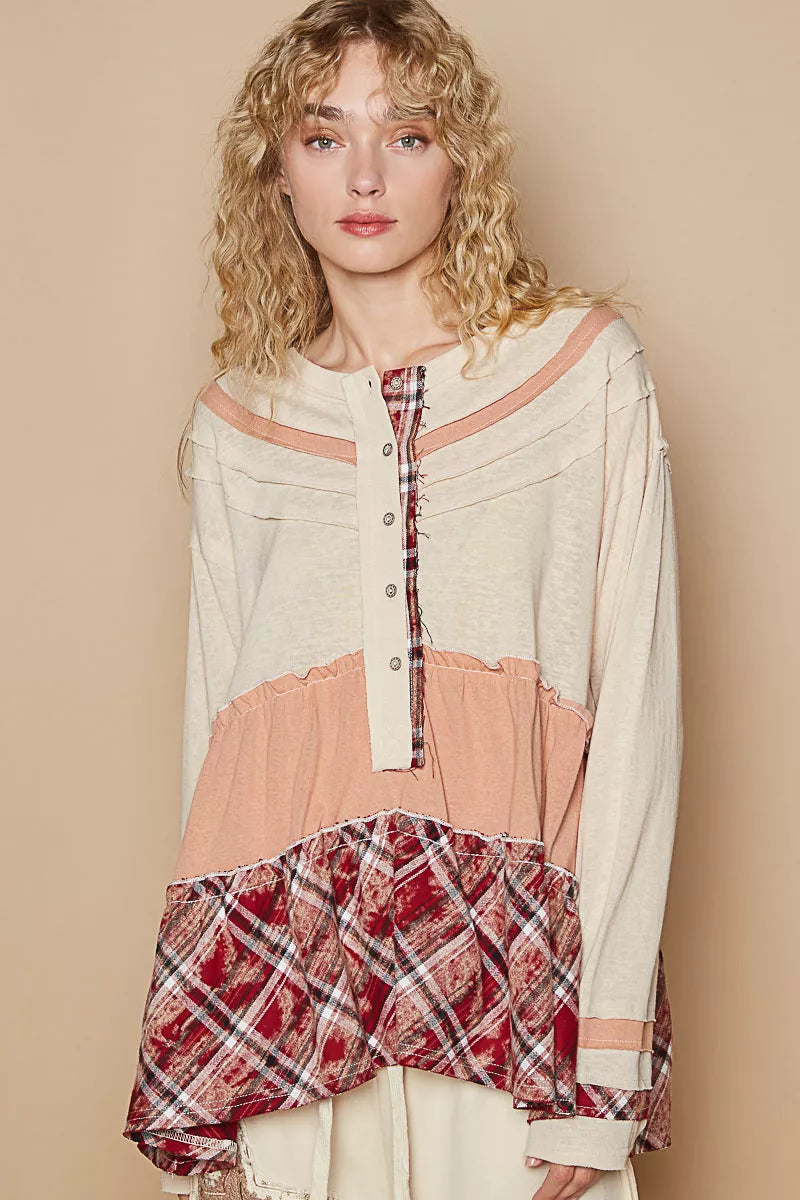 POL Round Neck Half Button Color Block Top with Merrow Edge Detail