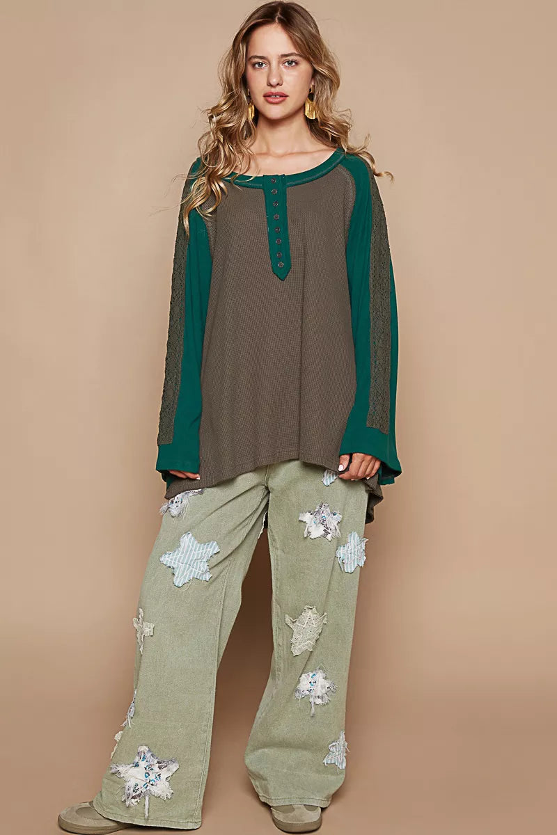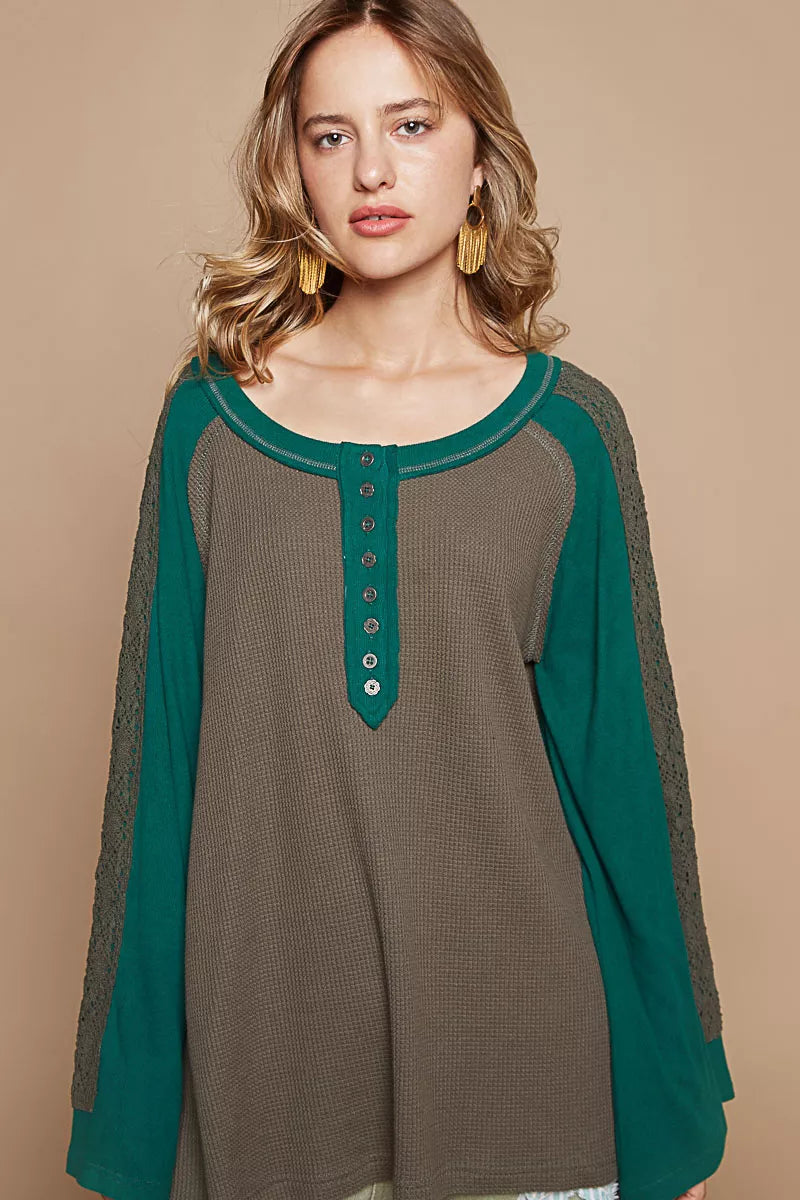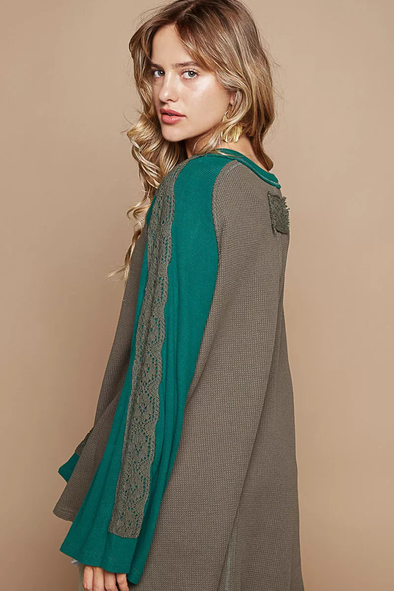 This scoop neck top features elegant long sleeves with a striking contrast design. The delicate lace detail adds a touch of femininity and sophistication to the overall look. Perfect for both casual and dressy occasions, this top is versatile and stylish. The scoop neck offers a flattering neckline that suits various body types. Elevate your wardrobe with this chic and timeless piece.