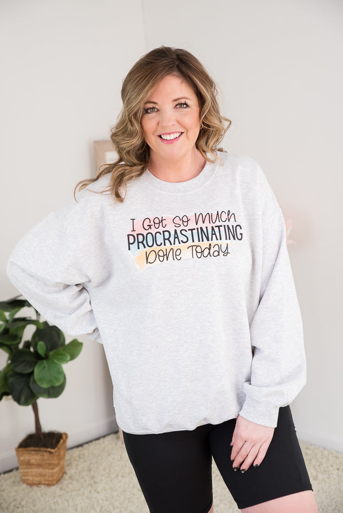 I got so much procrastinating done today. Wear this humorous gray crewneck sweatshirt with leggings or denim any day of the week.