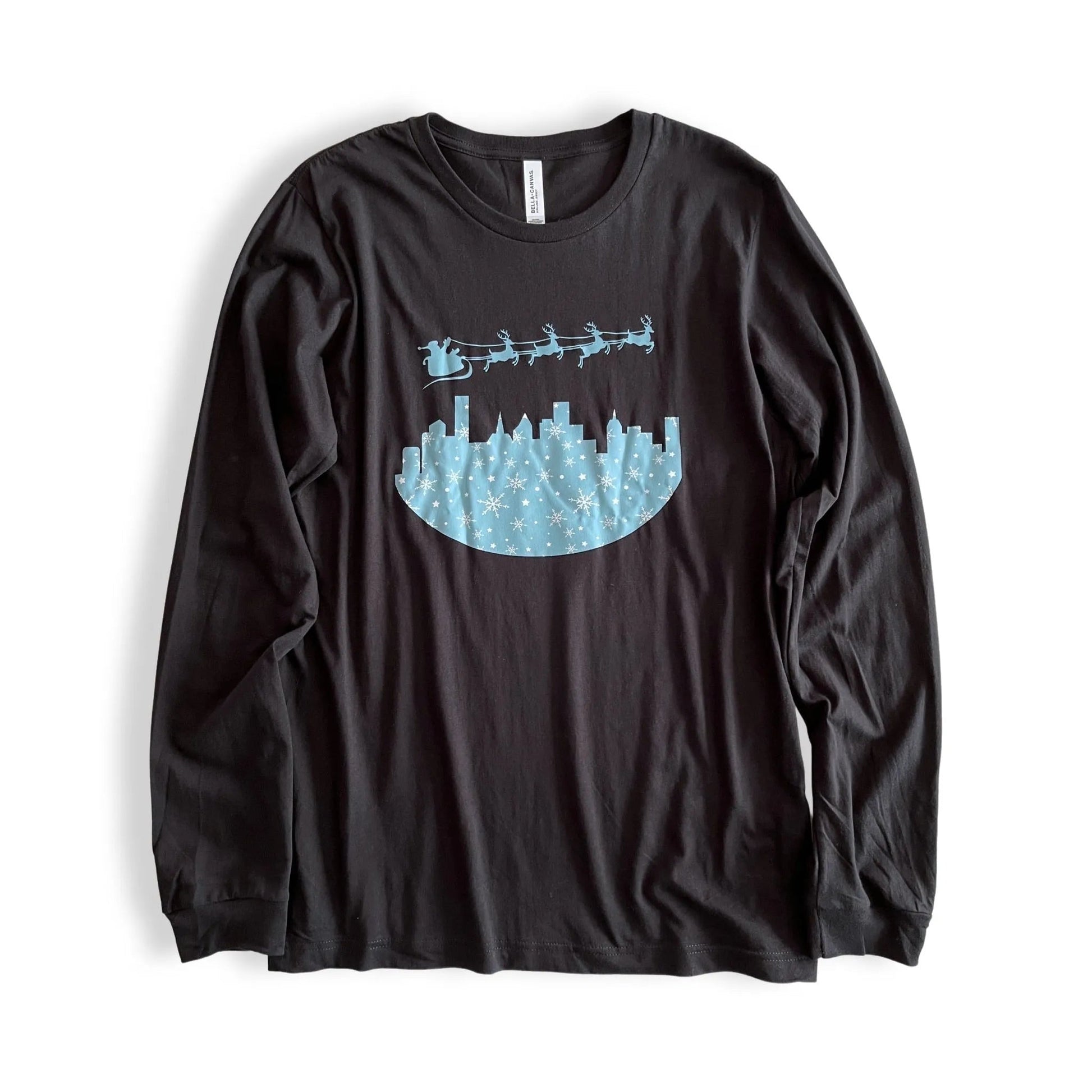 Nothing brings that exciting Christmas feeling like seeing Santa and his reindeer in the sky! Wear this long sleeve graphic tee with a beautiful white and blue design with your favorite Judy Blues.