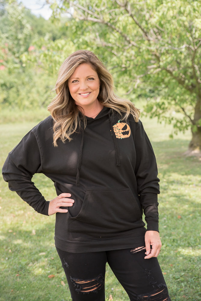 Whether you are feeling semi sweet or semi spooky, we've got you covered with this new hoodie! The black hoodie has a front and back design festive design. Toss it on with our Judy Blue Jeans for your next outdoor fall activity.