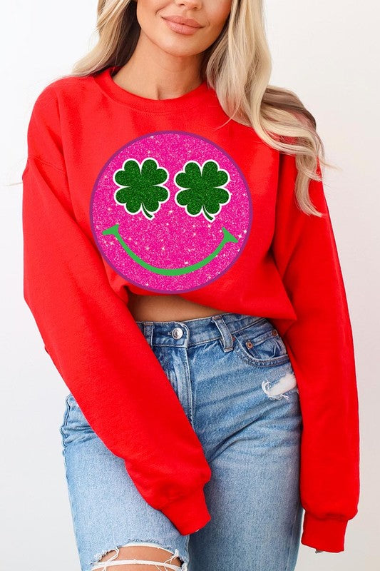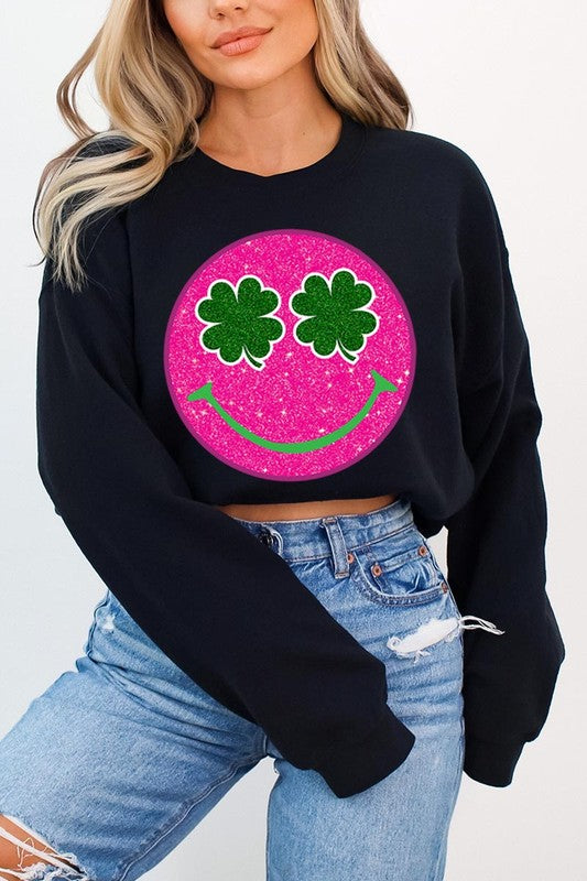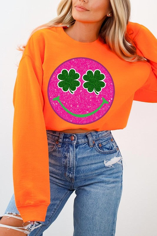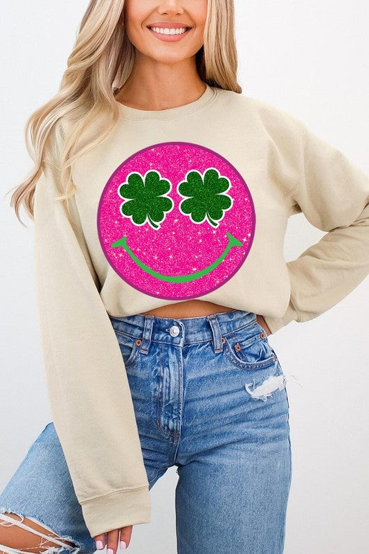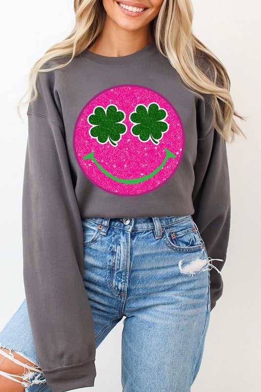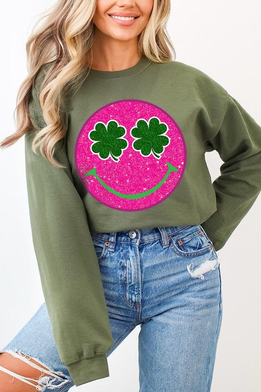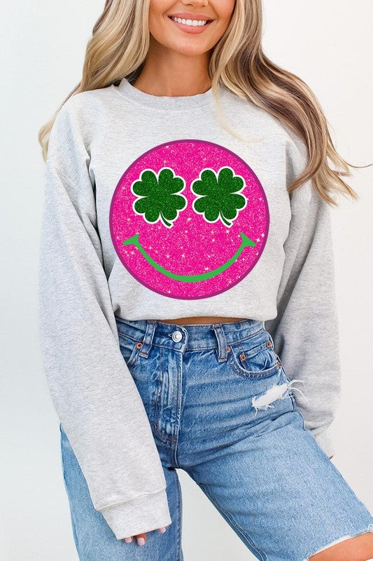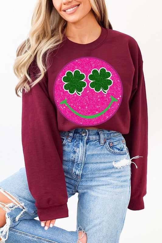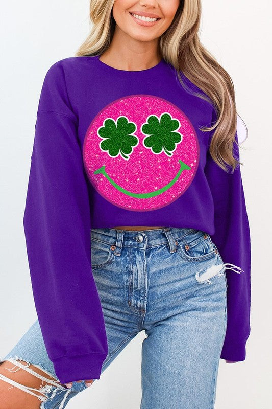 Smile Face St Patricks Day Glitter Patch Graphic Fleece Sweatshirts.