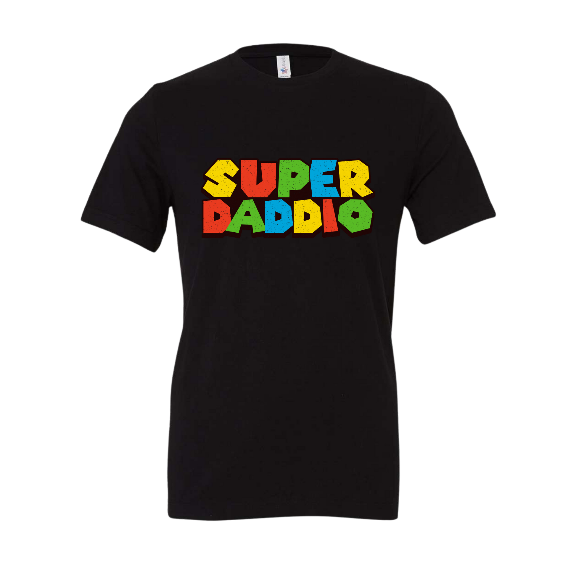 It's a me- Super Daddio! Rock this black graphic tee day and night.