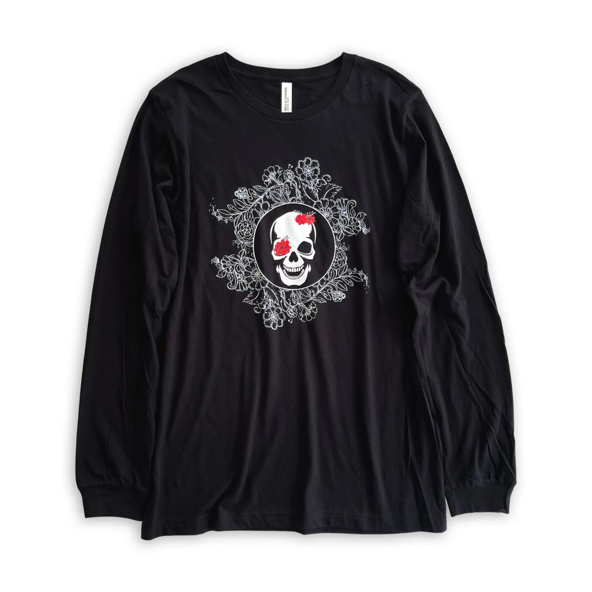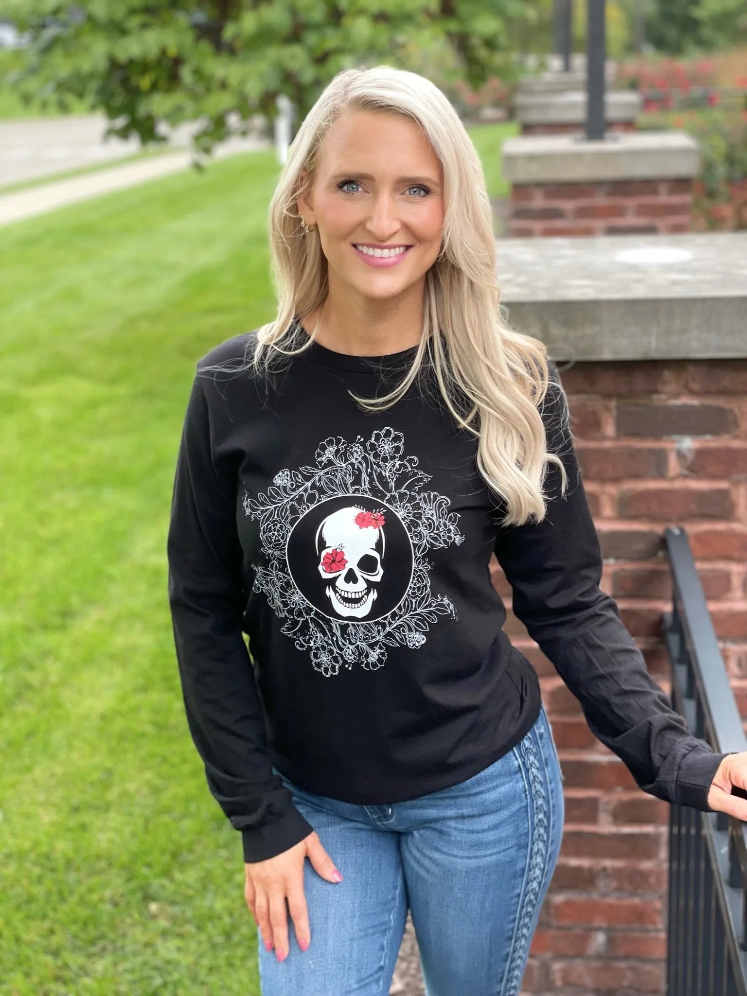 A skull with a pop of red flowers is surrounded by a ring of incredibly detailed flowers. Pair the long sleeve tee with our Judy Blue Tummy Control Jeans and Kayak Slides to complete the outfit.