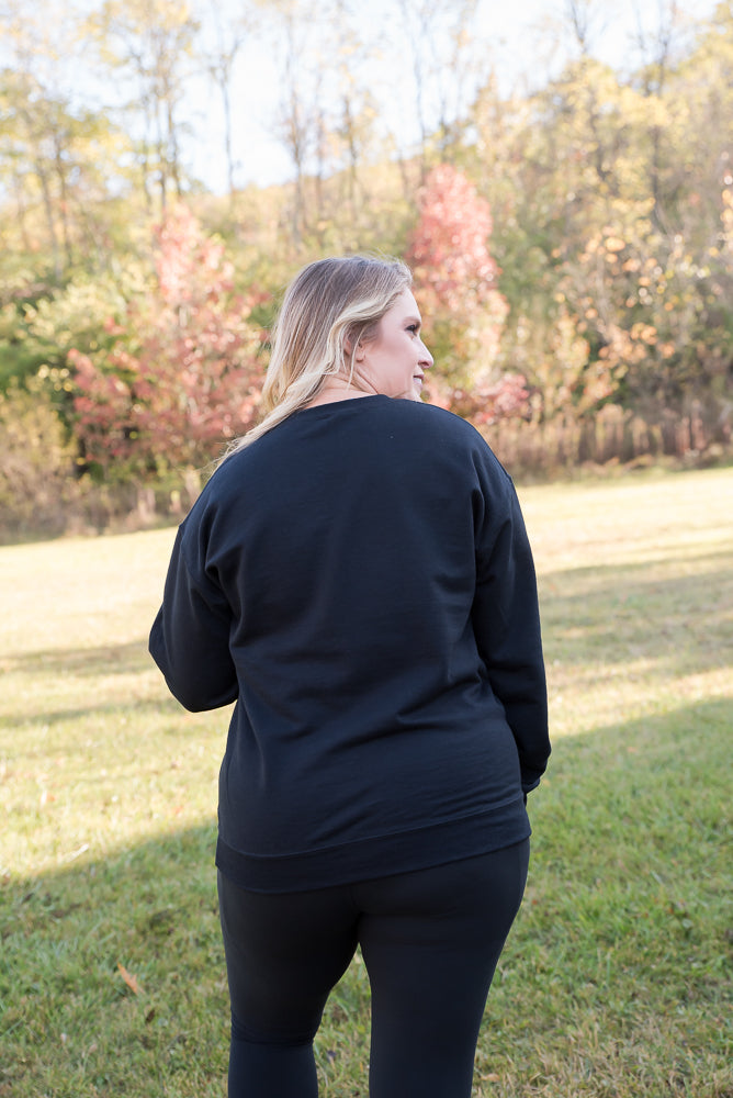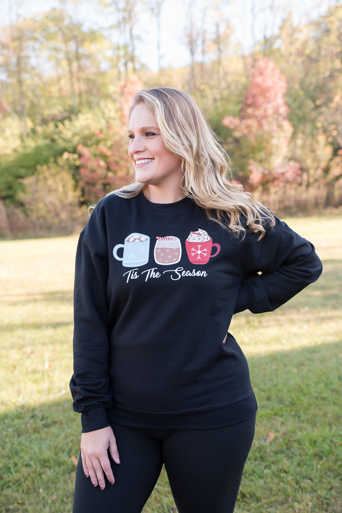 Tis the season for hot chocolate with marshmallows and reading a book by the fire. Stay cozy in this black sweatshirt and our Now I Know Joggers or leggings.