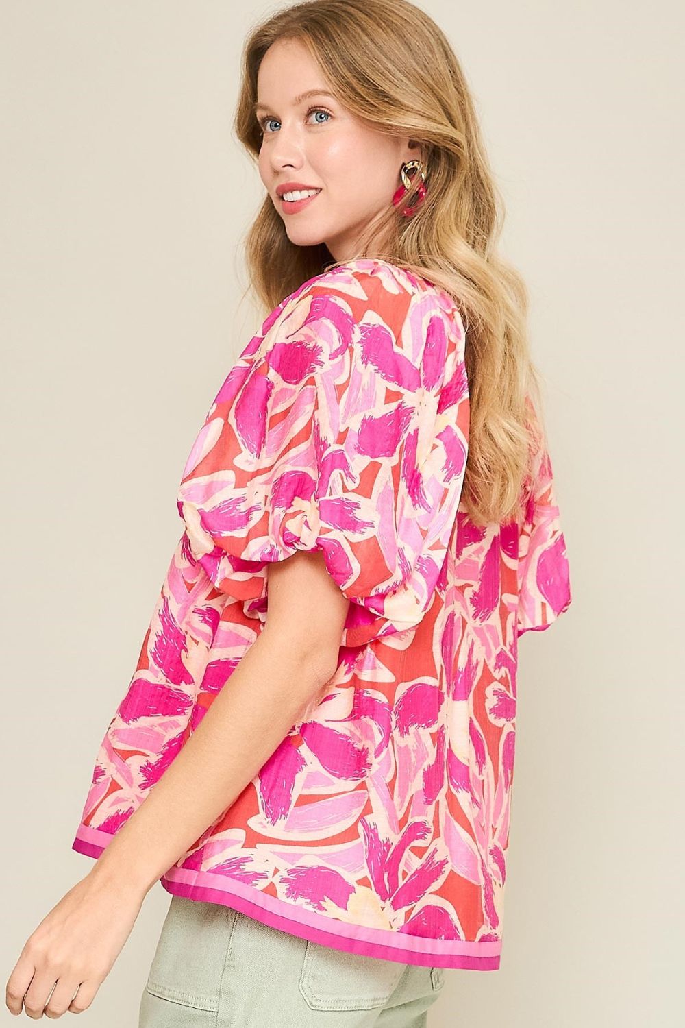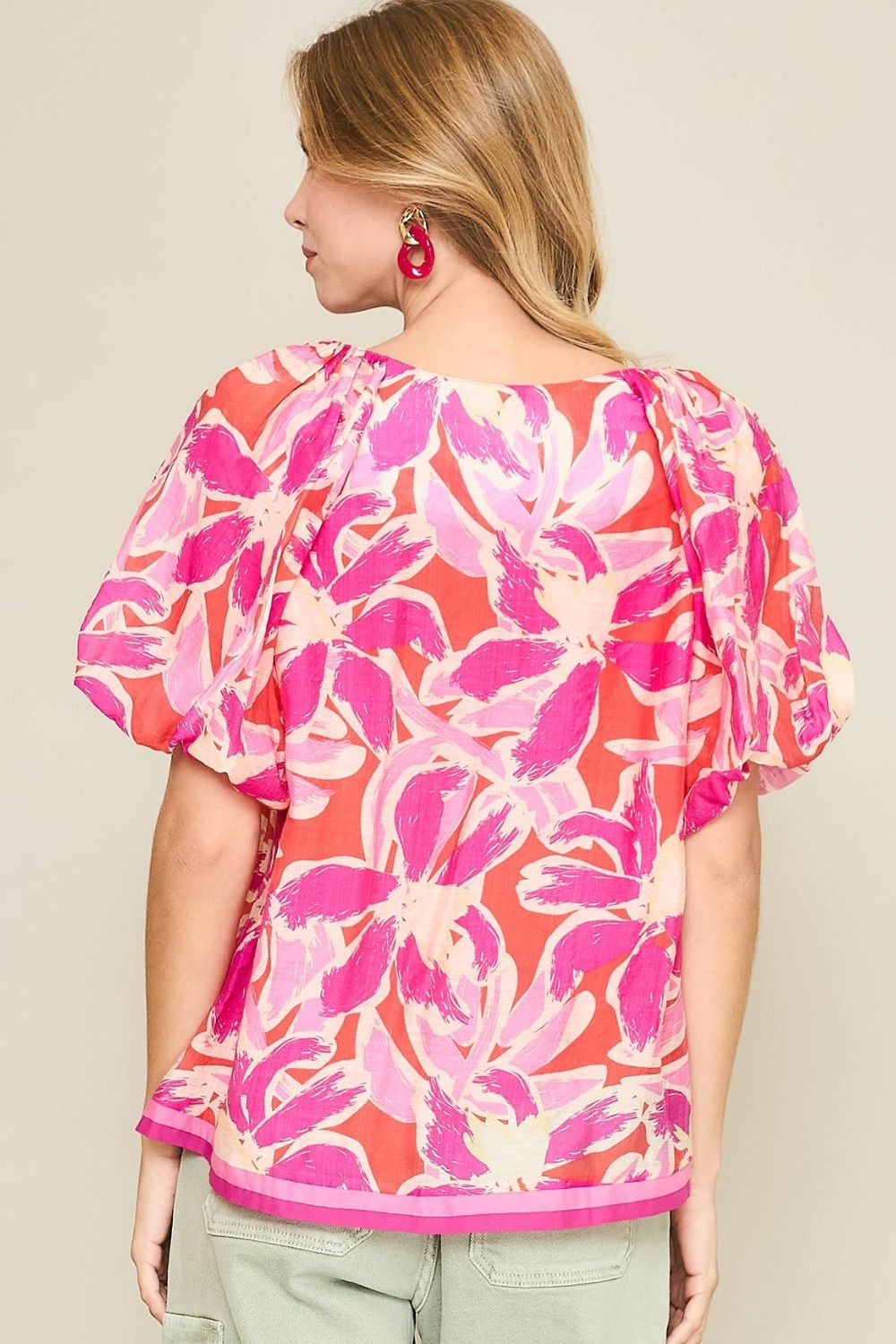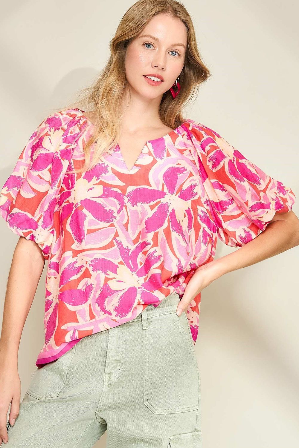 The floral notched puff sleeve blouse features a delicate floral print and a stylish notched neckline. The puff sleeves add a touch of femininity and volume to the blouse. This versatile piece can be dressed up or down for various occasions, making it a great addition to your wardrobe. Pair it with jeans for a casual look or with a skirt for a more dressed-up ensemble.