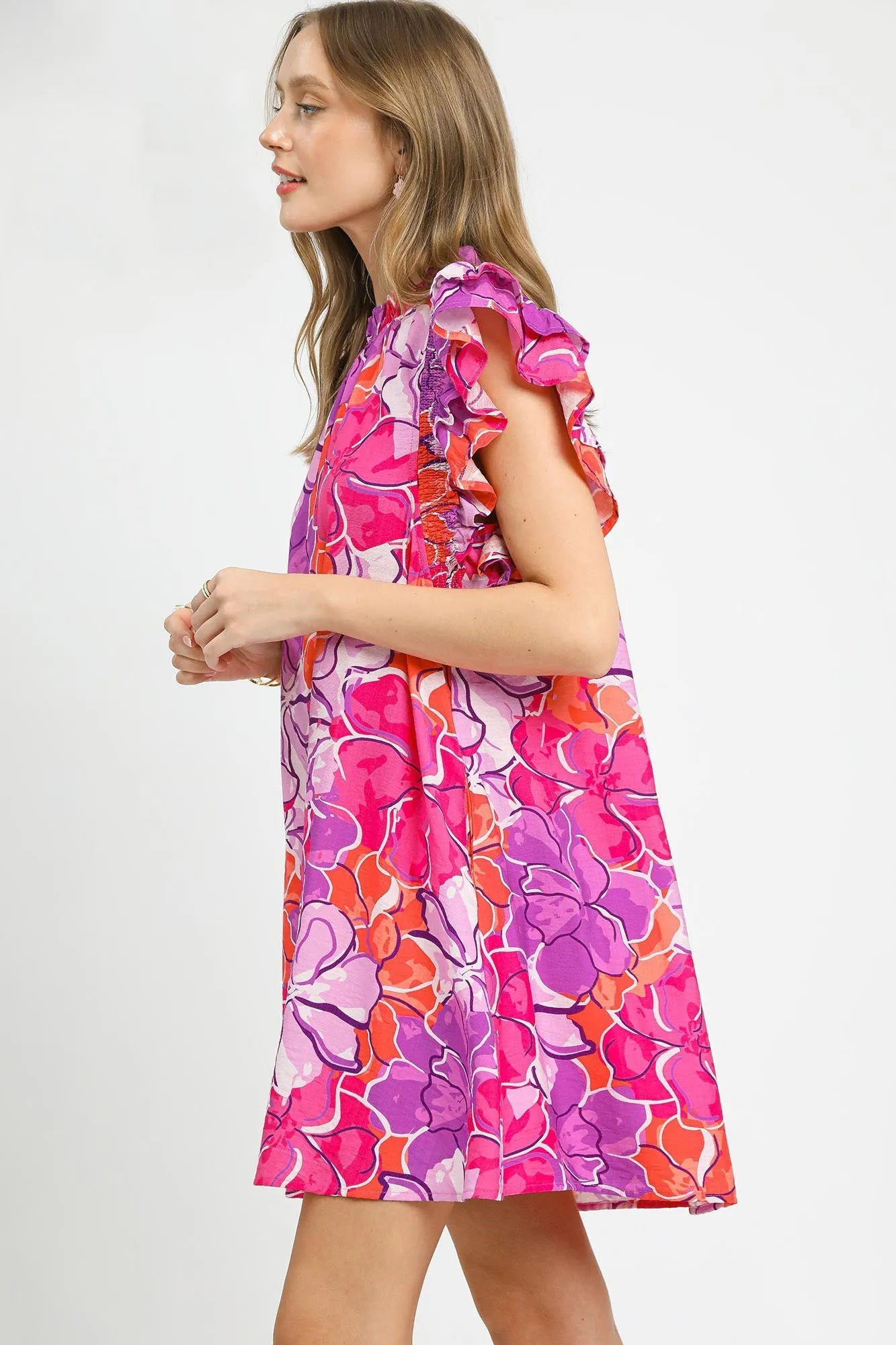 This eye-catching mini dress features a stunning all-over floral print in vibrant shades of pink, purple, and orange. The relaxed A-line silhouette is crafted from lightweight, breathable fabric perfect for warm weather. Feminine ruffle cap sleeves add romantic detail while the round neckline keeps the look classic. The mini length hits above the knee for a flirty, youthful appeal. This versatile piece transitions effortlessly from daytime brunches to evening gatherings, making it an essential addition to any spring/summer wardrobe.