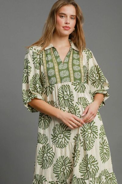 This border print tiered midi dress features a unique and eye-catching design. The tiered layers add movement and texture to the dress. Perfect for a bohemian and chic look, this midi dress is a stylish choice for any summer event or outing.