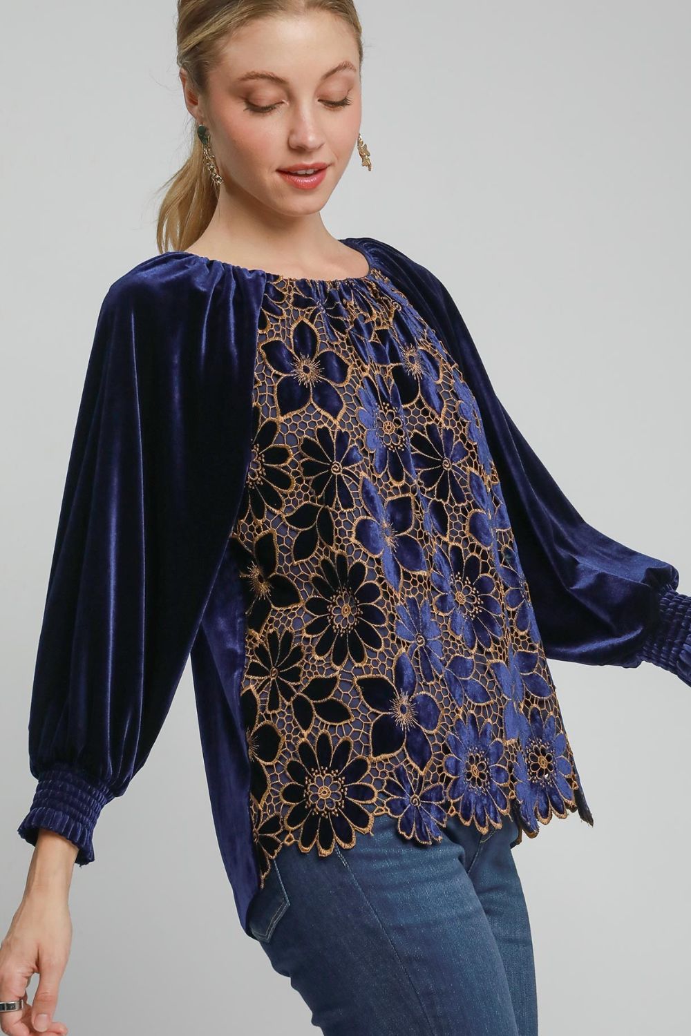 The floral lace velvet raglan sleeve top combines delicate lace and luxurious velvet for a sophisticated and elegant look. The raglan sleeves add a unique and stylish touch to the top's design. The floral lace detailing adds a romantic and feminine vibe to the overall aesthetic, making it a versatile piece that can be dressed up or down for various occasions.