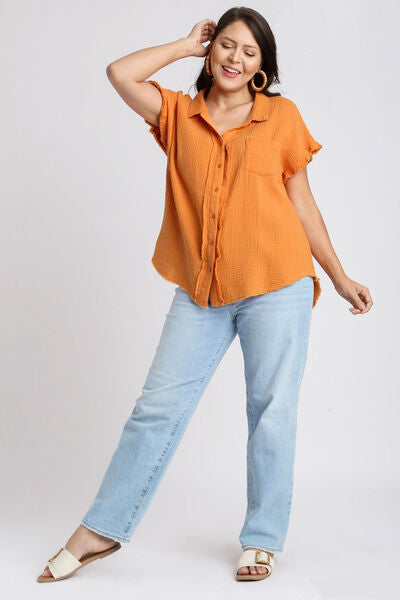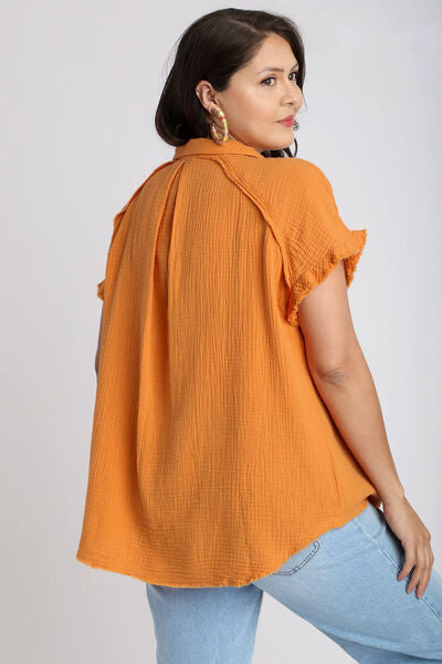 Umgee Full Size Frayed Hem Collared Neck Short Sleeve Shirt Plus Size