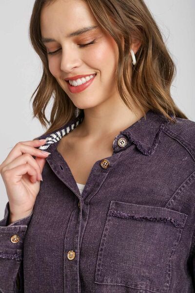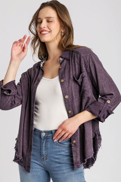 Umgee Full Size High Low Raw Hem Mineral Wash Button Down Shirt Plus Size