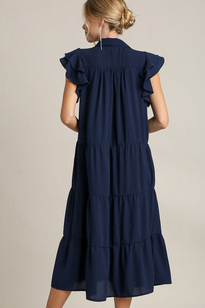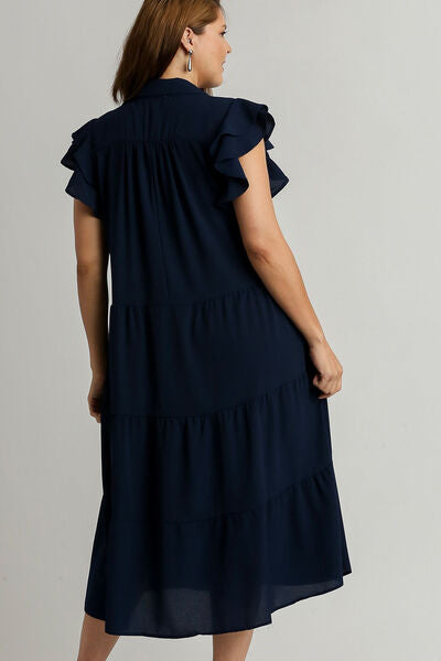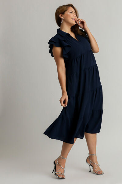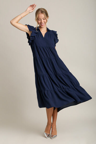 This dress features a Johnny collar, which is a unique and trendy variation of the traditional collar style, adding a modern touch. The ruffle cap sleeves give a delicate and romantic feel to the dress, enhancing its overall femininity. The tiered design creates a layered and textured look, adding depth and visual interest to the garment. This dress is perfect for various occasions, from casual outings to more formal events, offering a stylish and versatile option for your wardrobe.