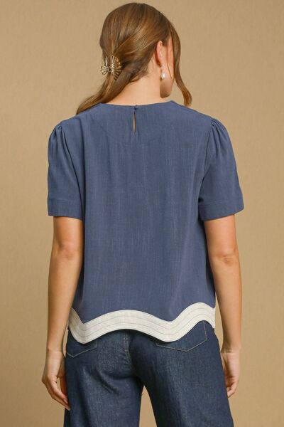 This top is made from a linen blend fabric, offering a lightweight and breathable feel perfect for the summer months. The scalloped hem detailing adds a touch of elegance and visual interest to the design. The blend of linen provides a comfortable and airy fit, making it ideal for warm weather. This top is versatile and can be dressed up or down, adding a chic and sophisticated touch to your outfit.