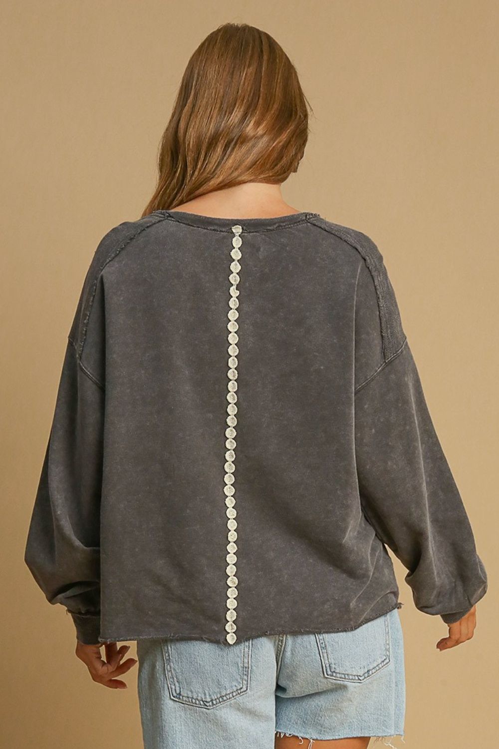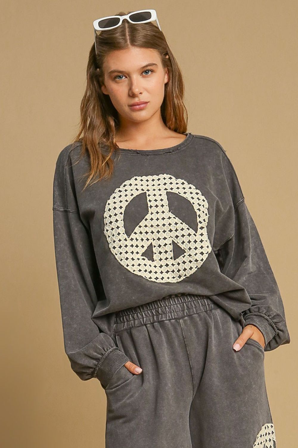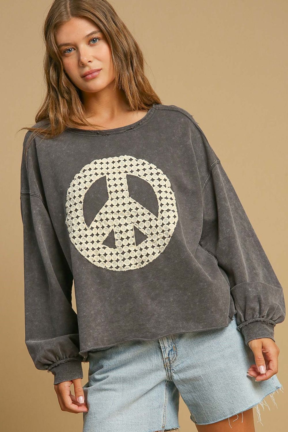 Peace Lace Applique Mineral Wash Sweatshirt is a unique and stylish addition to your wardrobe. This cozy sweatshirt features delicate lace applique detailing, adding a touch of elegance to your casual look. Crafted from high-quality mineral wash fabric, it offers both style and comfort for everyday wear. Elevate your loungewear collection with this fashionable and versatile sweatshirt.
