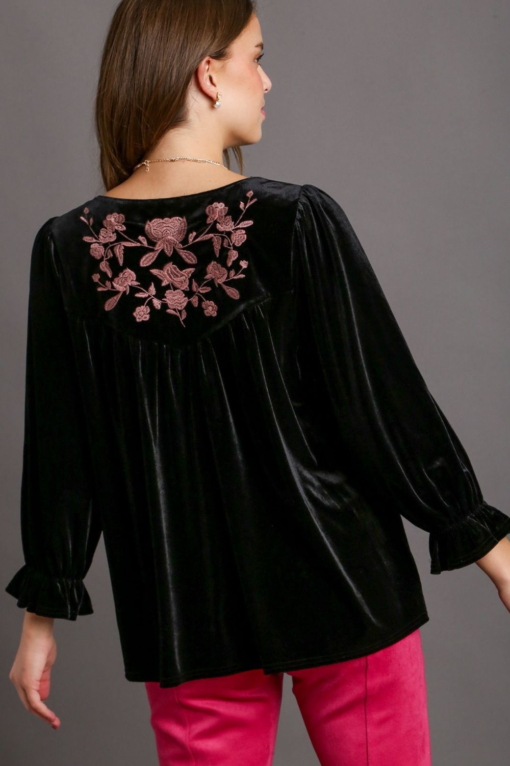 Umgee Full Size Velvet Embroidery Flounce Sleeve Top Plus Size