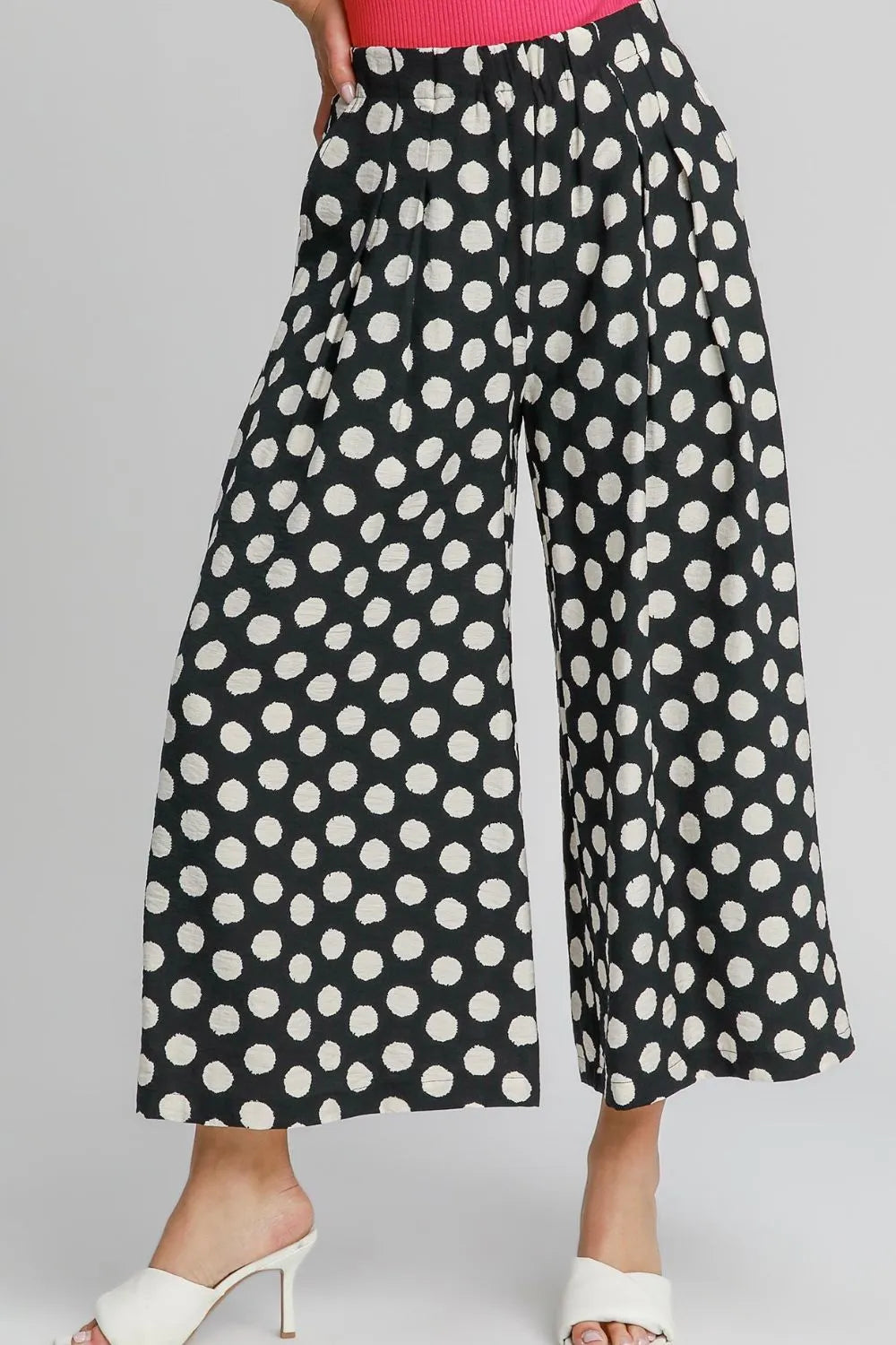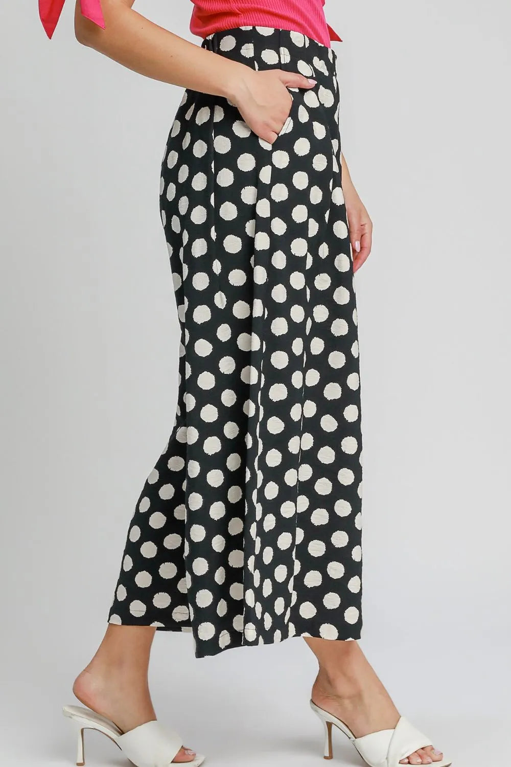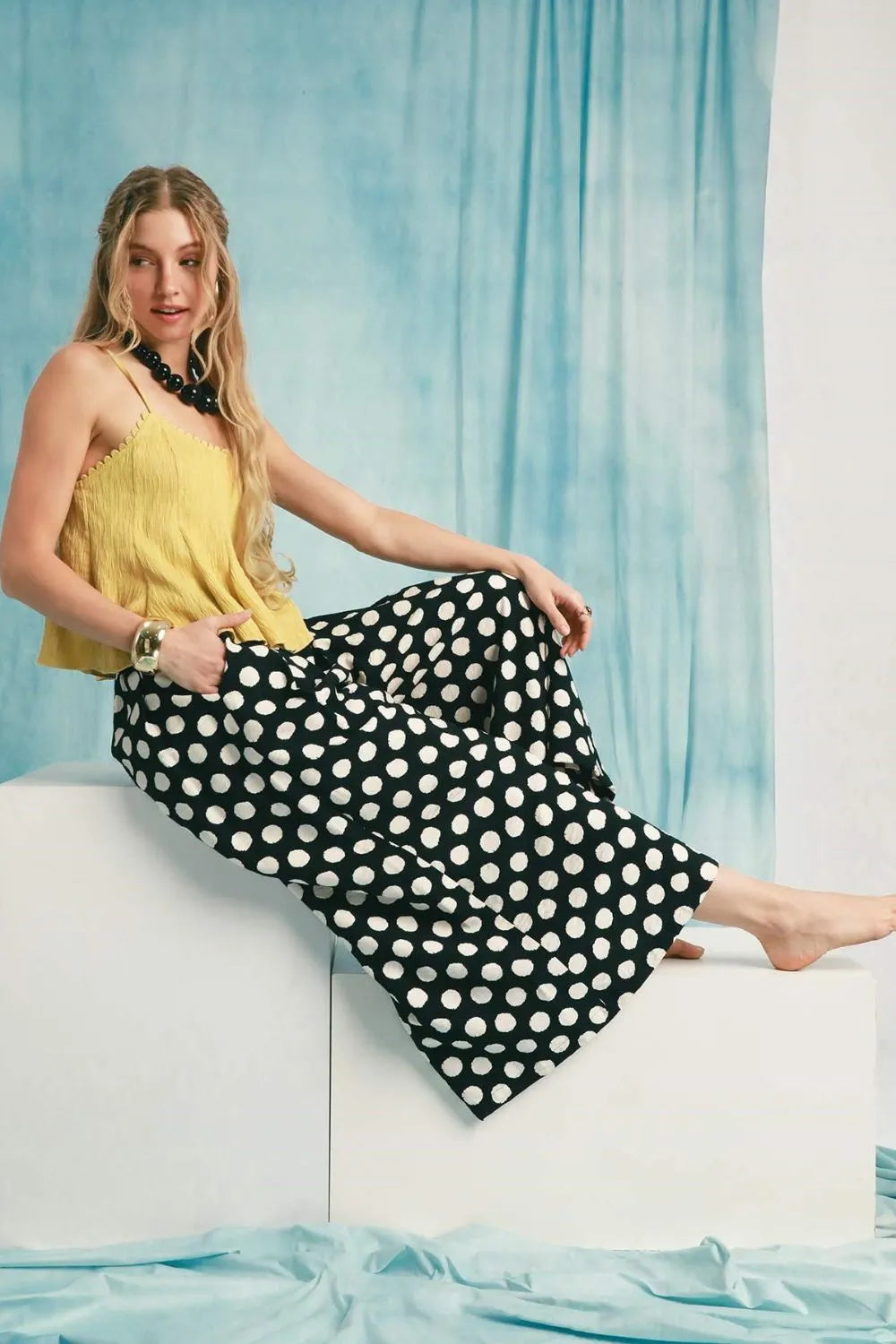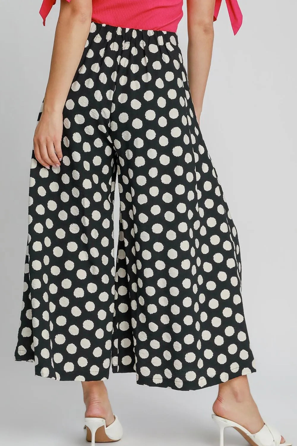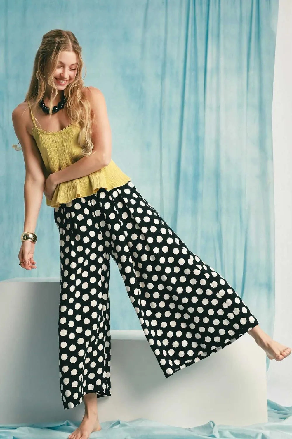 These stunning wide-leg palazzo pants feature a timeless black base adorned with bold white polka dots, creating a perfect retro-chic statement piece. Crafted from lightweight, flowing fabric that drapes beautifully, these pants offer exceptional comfort and movement. The high-waisted design flatters all body types while the ultra-wide legs create an elegant, dramatic silhouette. The cropped ankle length adds modern versatility, making them perfect for showcasing your favorite footwear. With functional side pockets and an elastic waistband, these pants combine vintage glamour with contemporary comfort, ideal for everything from casual brunches to evening events.
