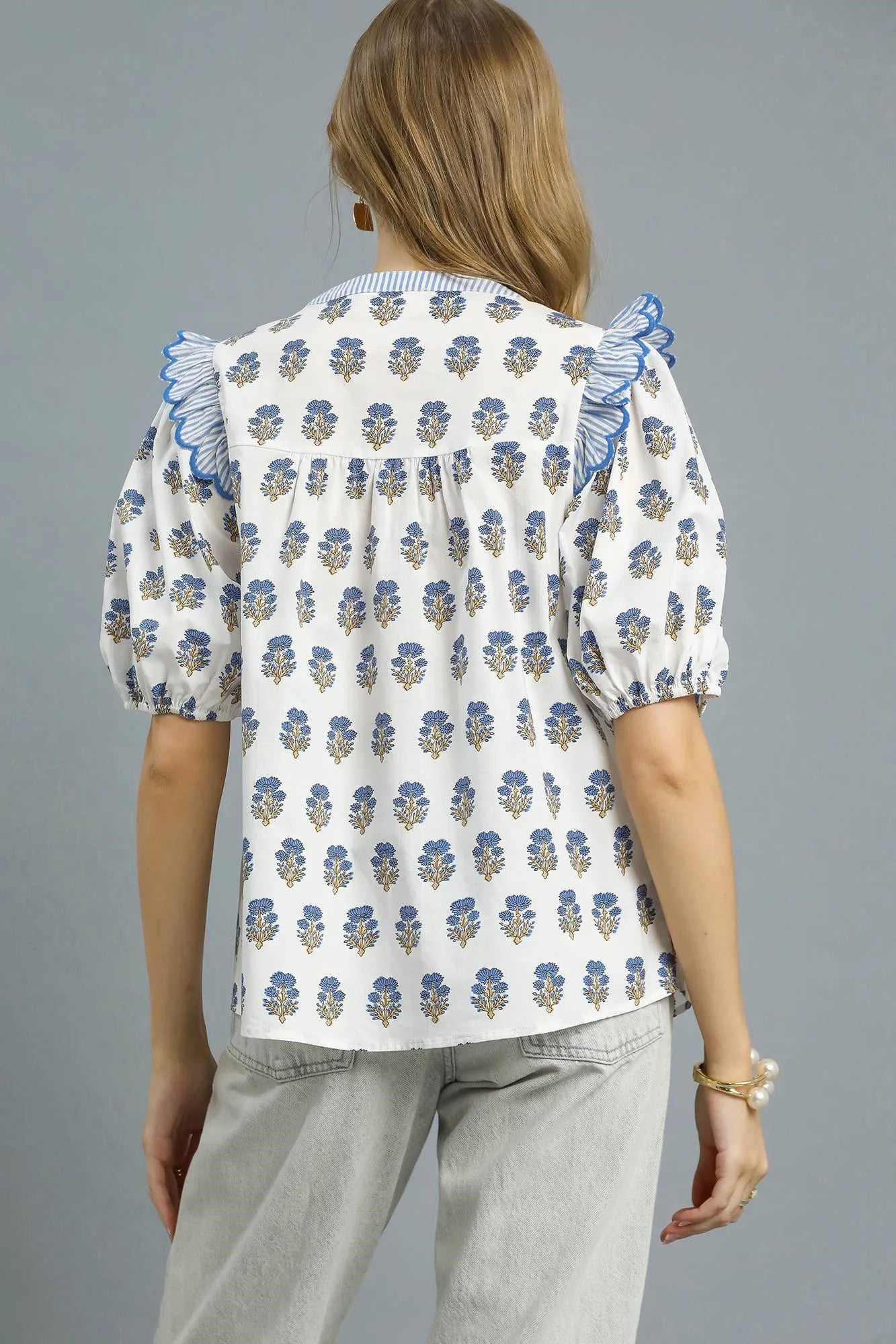This charming bohemian-inspired blouse features a delicate blue floral print on white fabric, crafted from lightweight and breathable cotton blend material. The standout ruffle trim detail at the neckline adds feminine flair, while the relaxed fit and short puff sleeves ensure all-day comfort. Perfect for casual outings, this versatile top pairs beautifully with jeans, shorts, or skirts for effortless spring and summer styling.