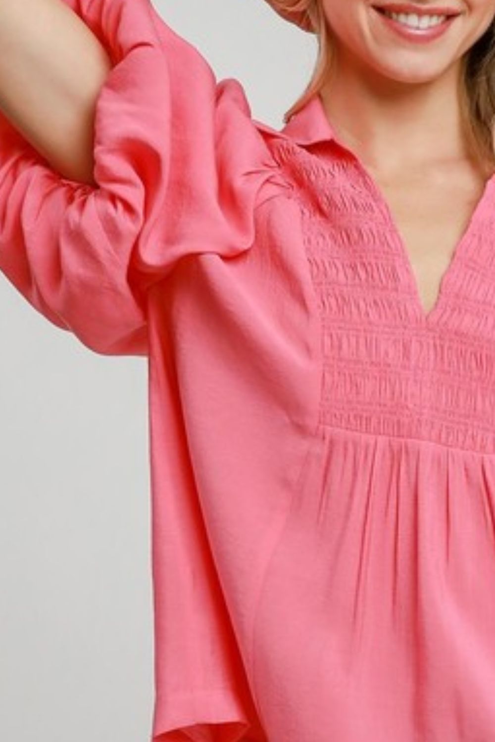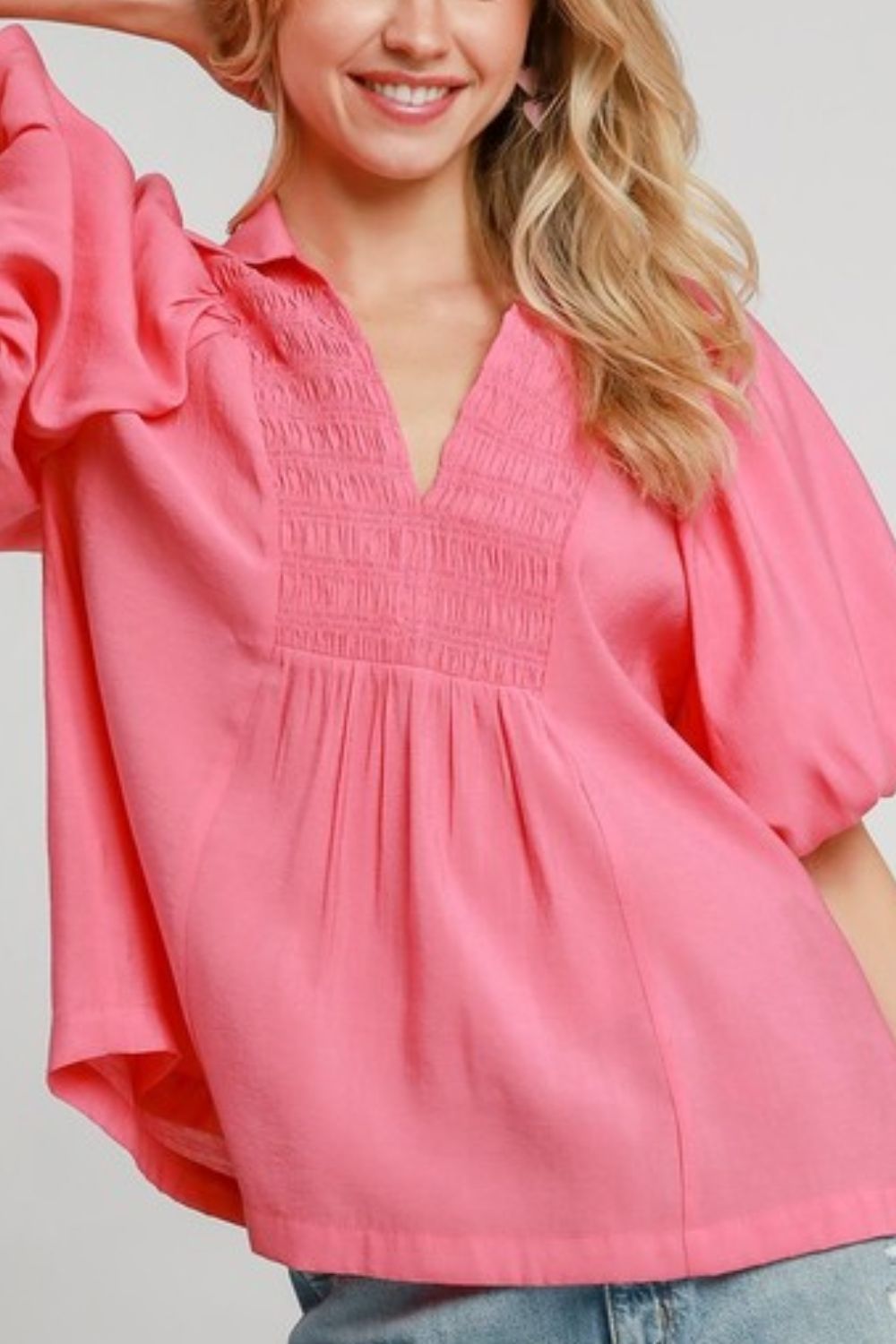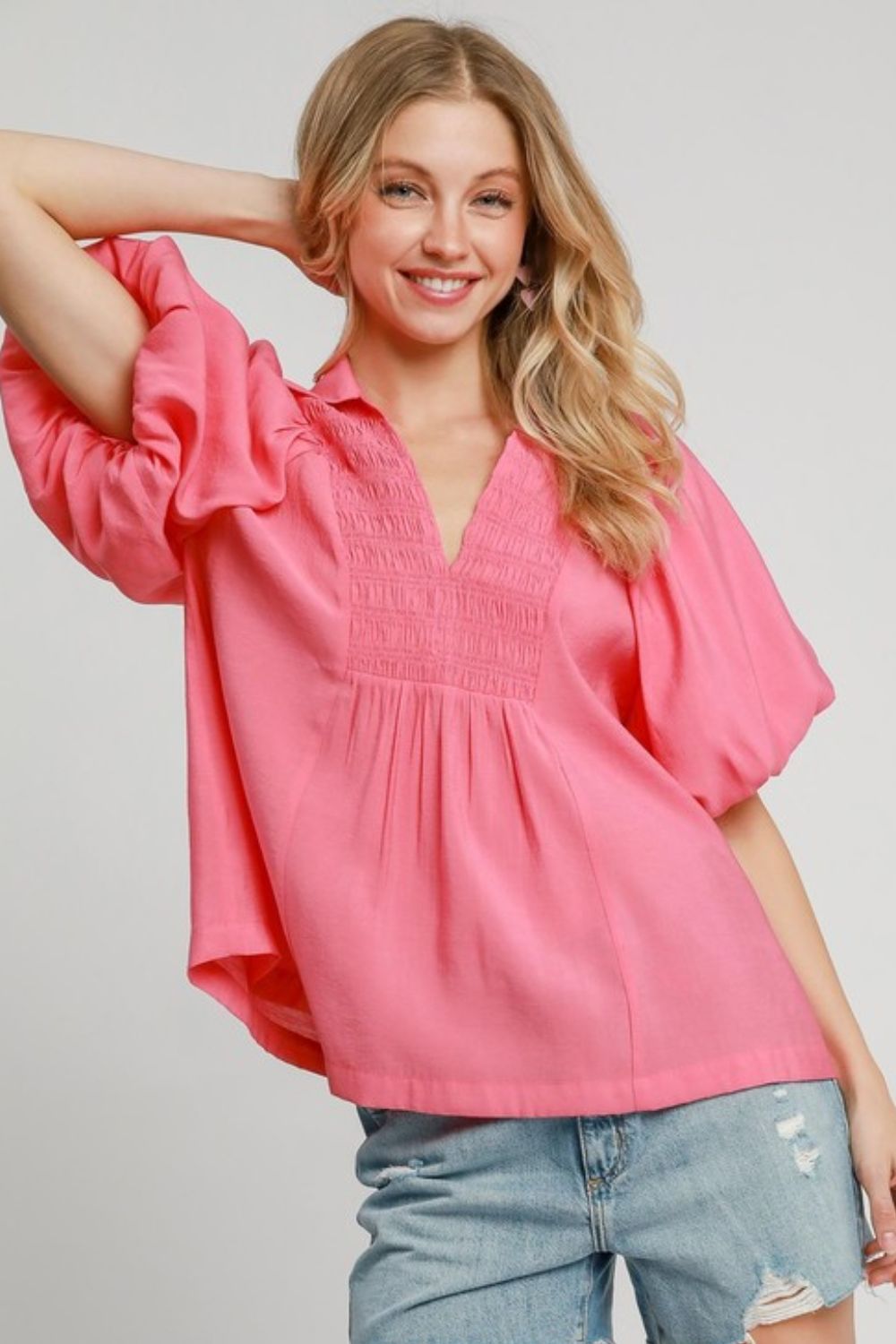 A smocked detail puff sleeve blouse features a fitted smocked bodice that accentuates the waist and creates a flattering silhouette. The puff sleeves add a touch of femininity and drama to the blouse. This style is versatile and can be dressed up or down, making it a great option for various occasions. Pair it with jeans for a casual look or with a skirt for a more dressed-up ensemble.