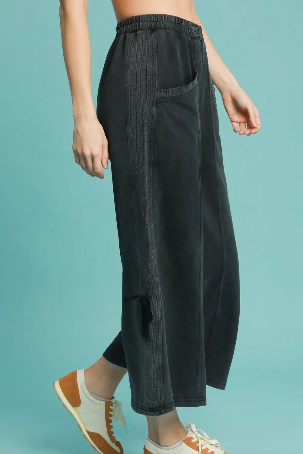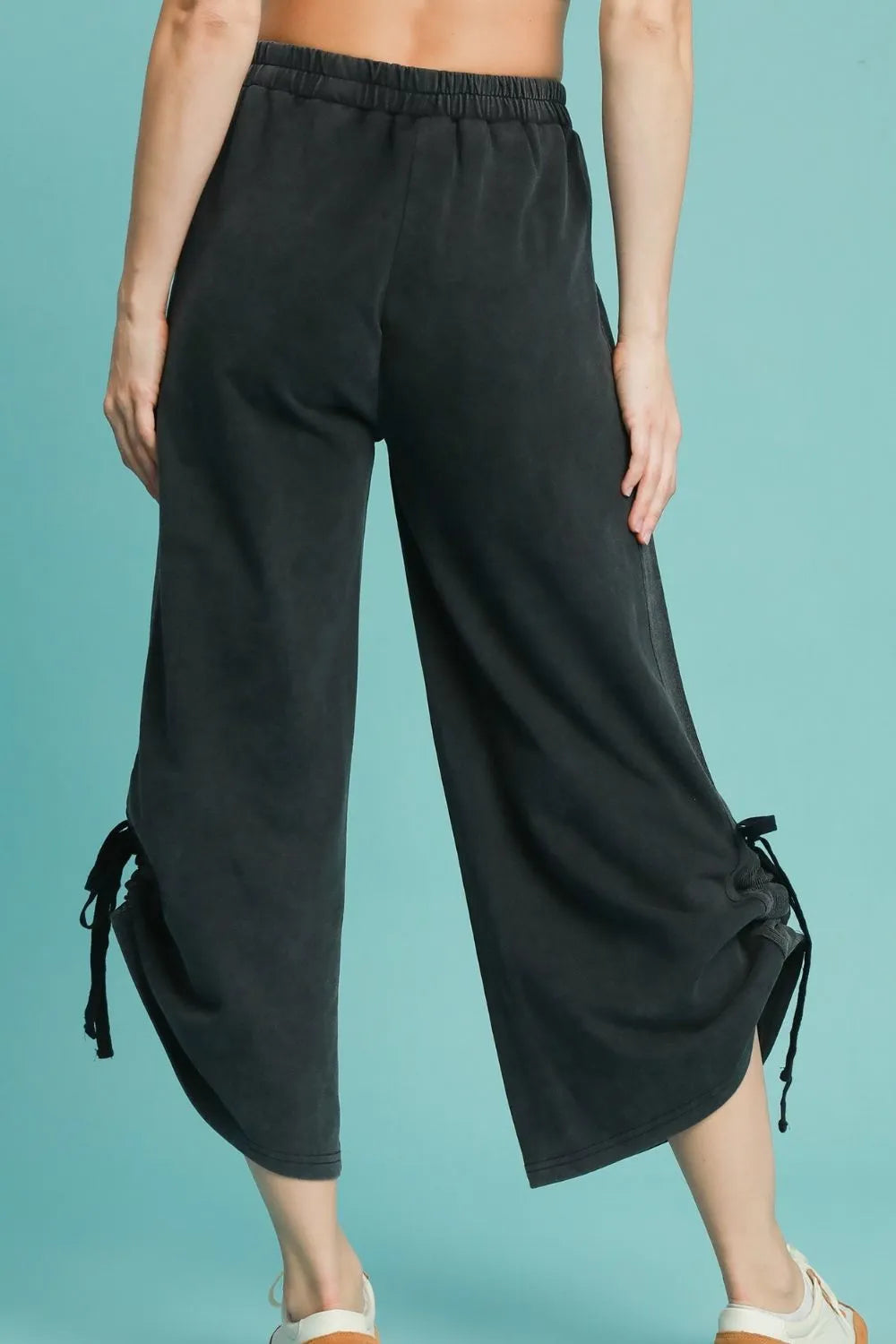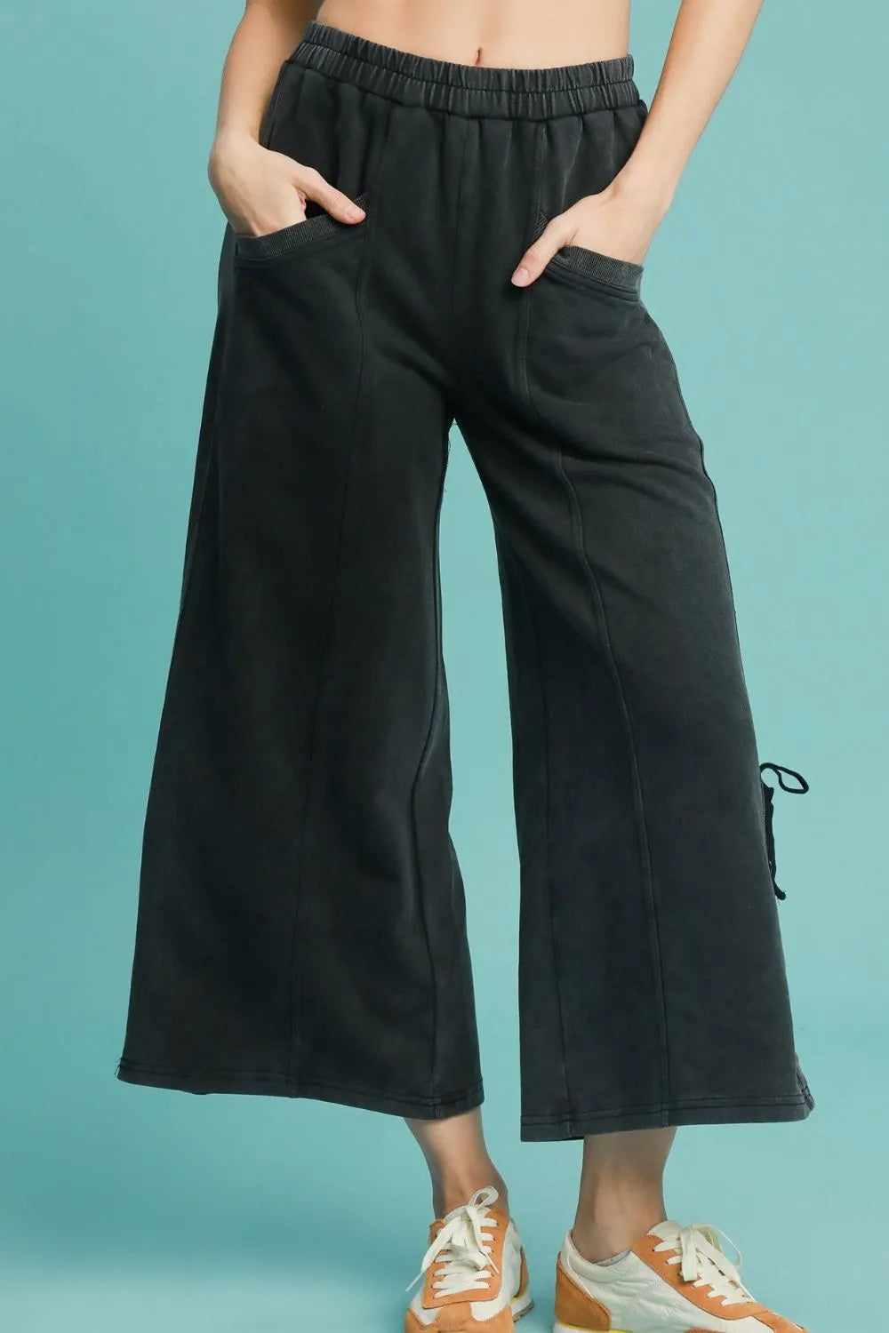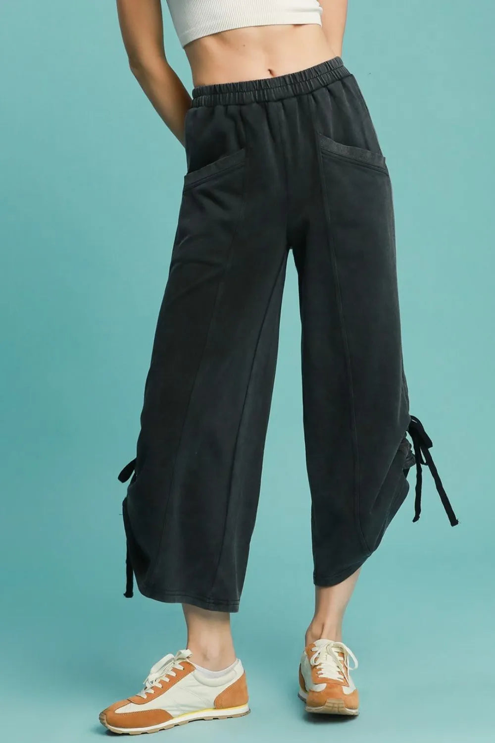 These fashion wide leg cropped pants feature a comfortable elastic waistband and stylish side drawstring details at the hem. Made from soft, breathable fabric blend, they offer both comfort and style for everyday wear. The relaxed fit and cropped length make them perfect for casual outings, yoga sessions, or lounging. The versatile black color easily pairs with any top, while the functional side pockets add practicality. The unique side tie accents create visual interest and allow for adjustable styling options.