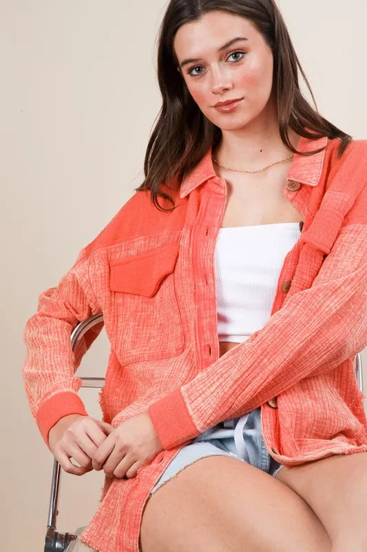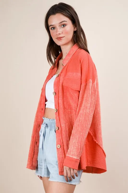 The Mineral Washed Oversized Gauze Shacket is typically made from lightweight and breathable fabric such as cotton or linen. The mineral washing process gives the garment a unique and slightly vintage look, while the oversized fit adds a relaxed and casual vibe. This shacket combines the elements of a shirt and a jacket, making it versatile for layering. The gauze material provides comfort and is suitable for wearing in various weather conditions. Pair it with jeans and a basic tee for a laid-back look, or layer it over a dress for a stylish twist. This shacket is a great addition to your casual wardrobe for an effortlessly cool outfit.