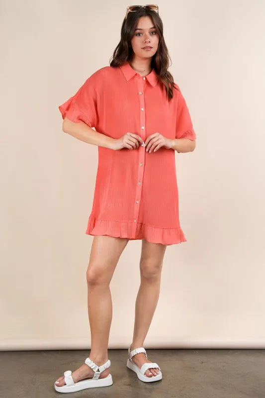 The Pleated Detail Button Down Mini Dress is a stylish and versatile piece for any occasion. Its pleated detailing adds a touch of sophistication, while the button-down design provides a classic look. This dress is perfect for both casual outings and more formal events. The mini length adds a playful vibe, making it easy to dress up or down. With its comfortable fit and flattering silhouette, this dress is sure to become a wardrobe favorite. Add some accessories and you're ready to turn heads wherever you go!